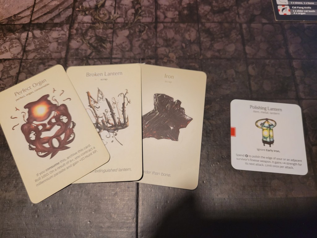 In the end I started by using up the Iron we just got. Together with the freshly pooped Scrap – thank you Scrap Worm – and the remaining Perfect Organ, I made a Polishing Lantern to help the Lantern Sword. This way Helios would no longer have to worry about Early Iron! Not that it had triggered often thus far.