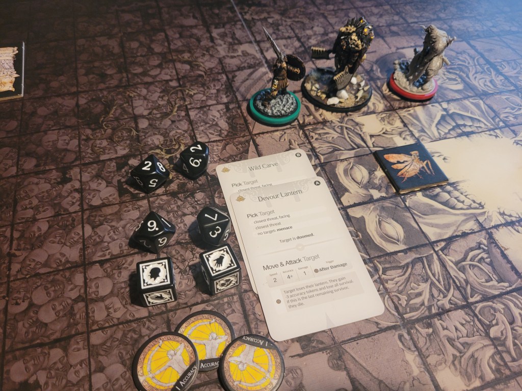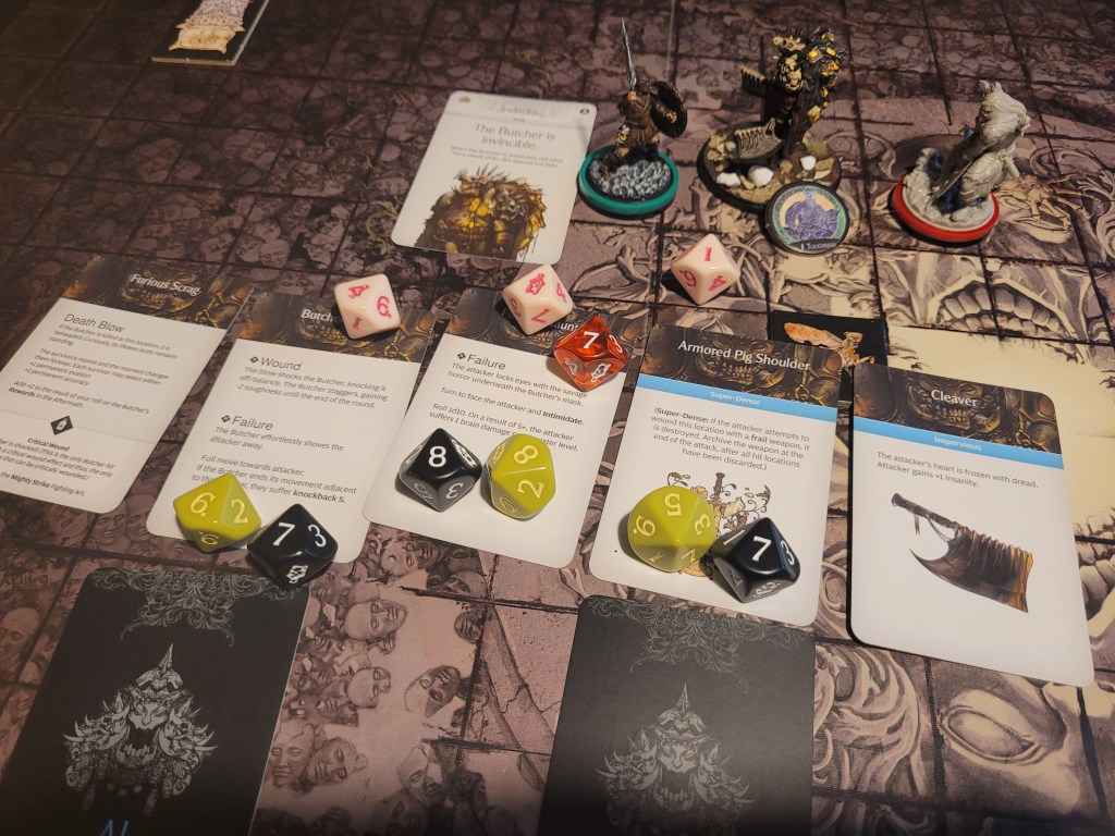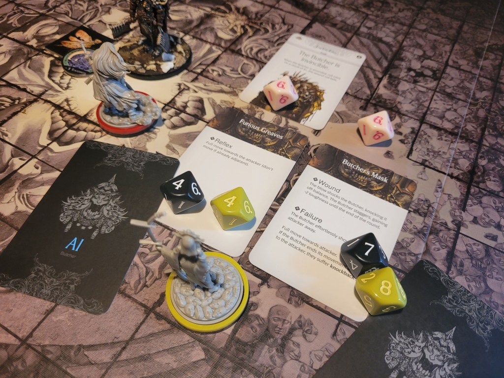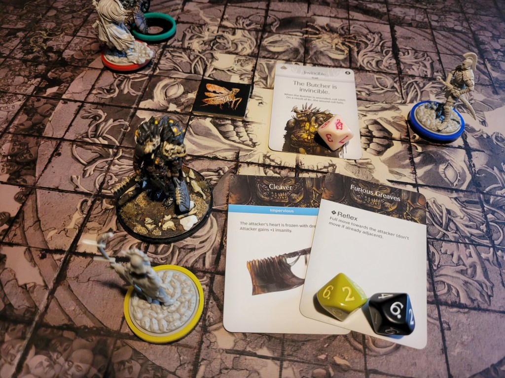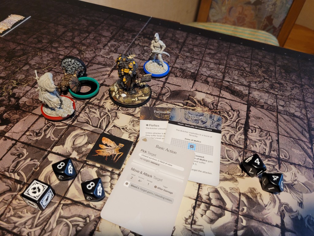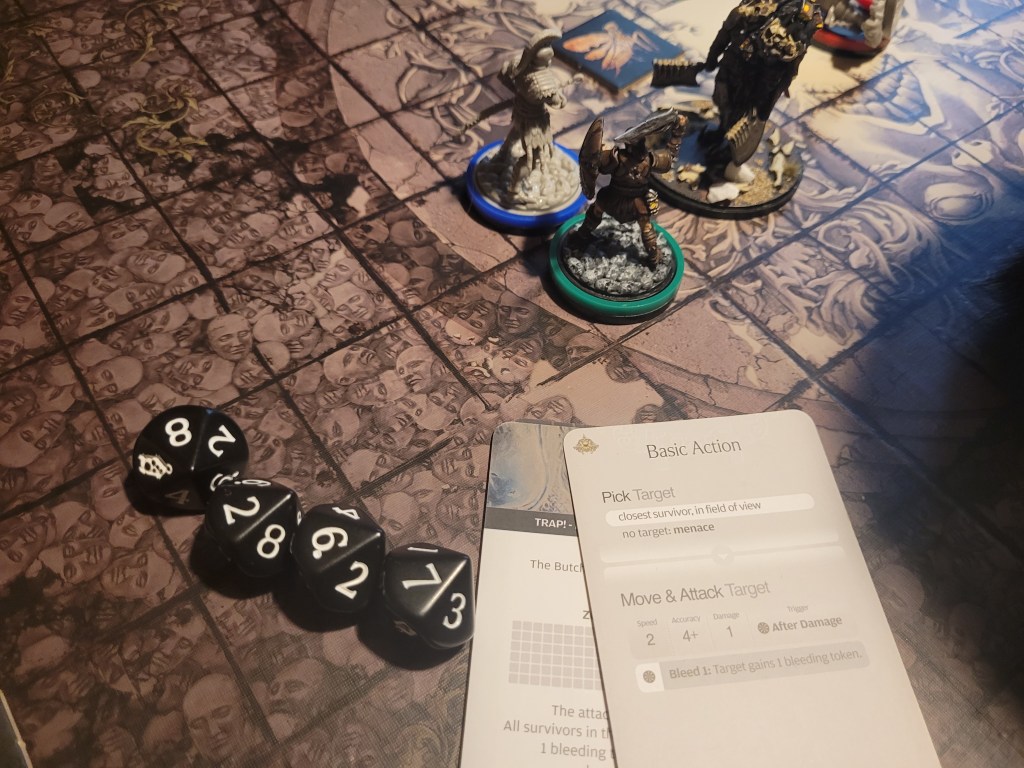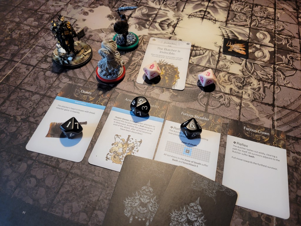 Phoenicia dashed into position and shot the monster after spending 3 survival in total to Overcharge and Embolden – a general tactic has emerged. 2 more hits found their marks, which meant 2 (3) more wounds were dealt. Invincible was not triggering for the monster this time, and I was hoping for it to stay that way. The Butcher did move over to Phoenicia on a reflex, knocking over Apollo to get to her.