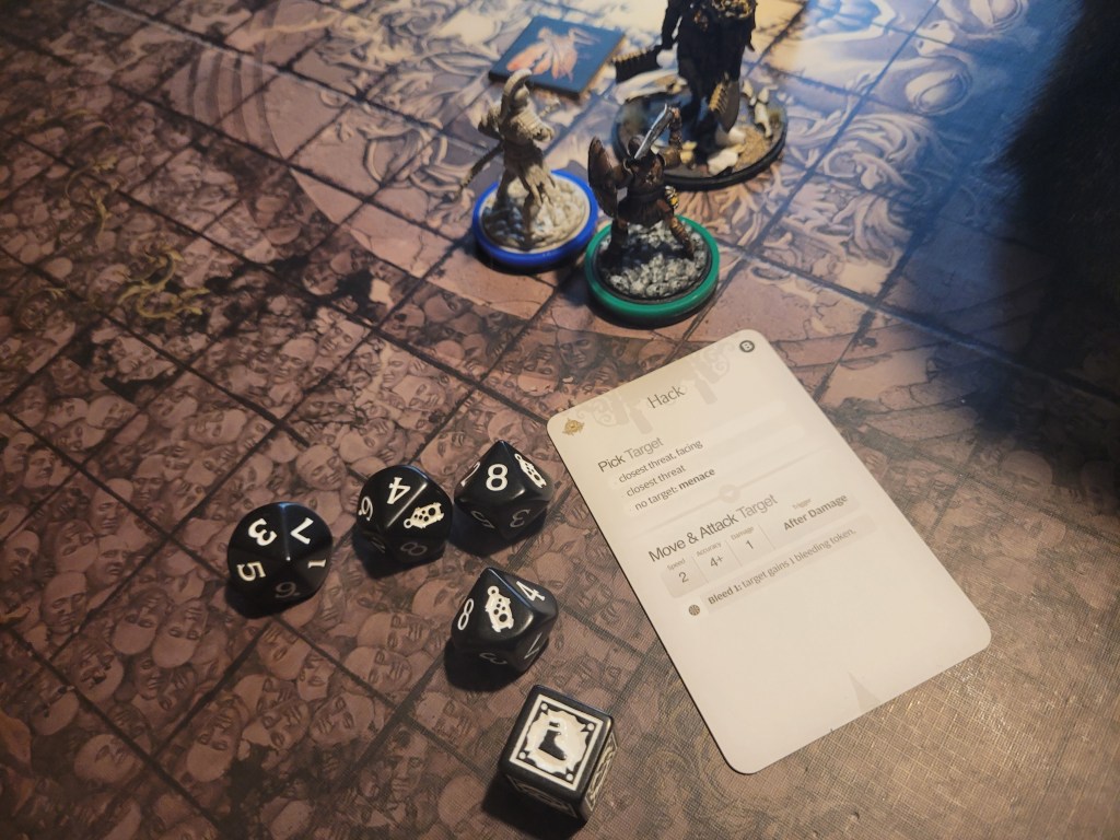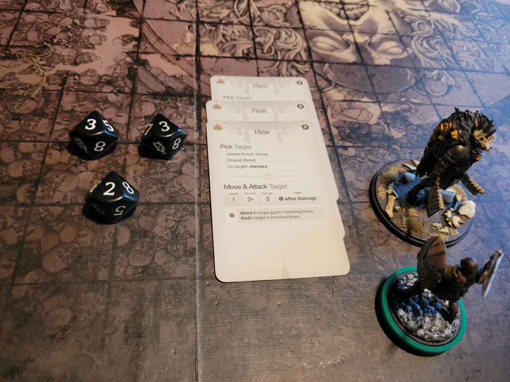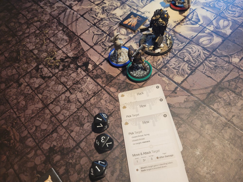 1 of 3: Wild Carve. All 4 attacks missed Helios (7+), but he took the bleed and damage from the secondary effect, bringing him to 4 bleed – yikes!