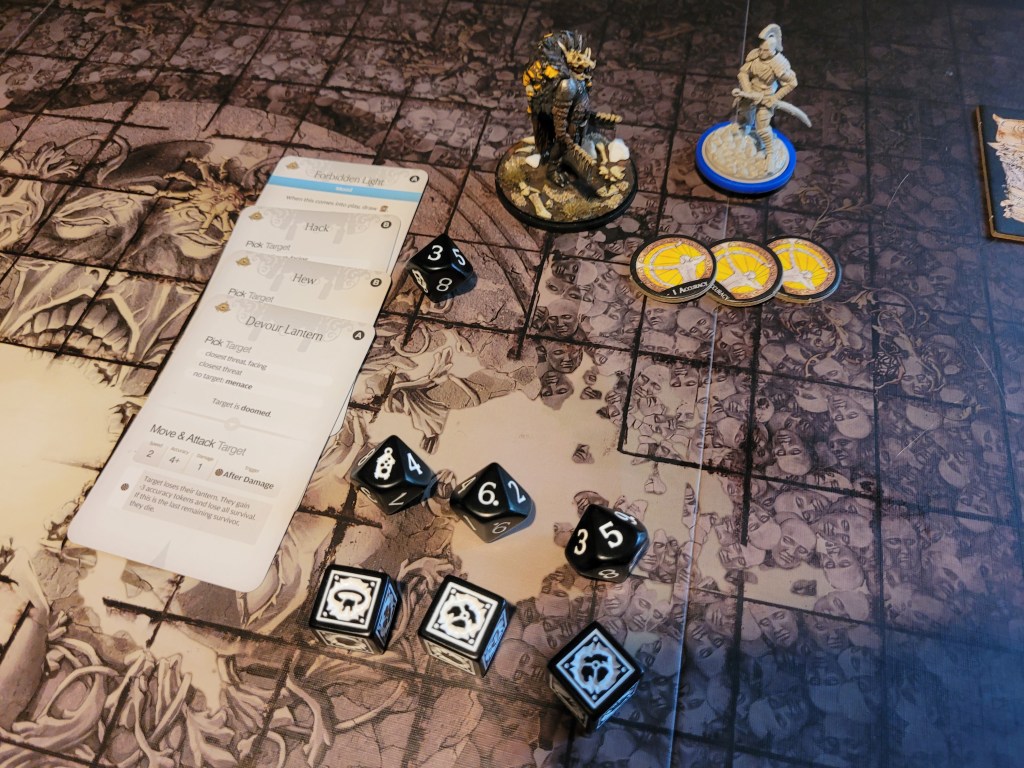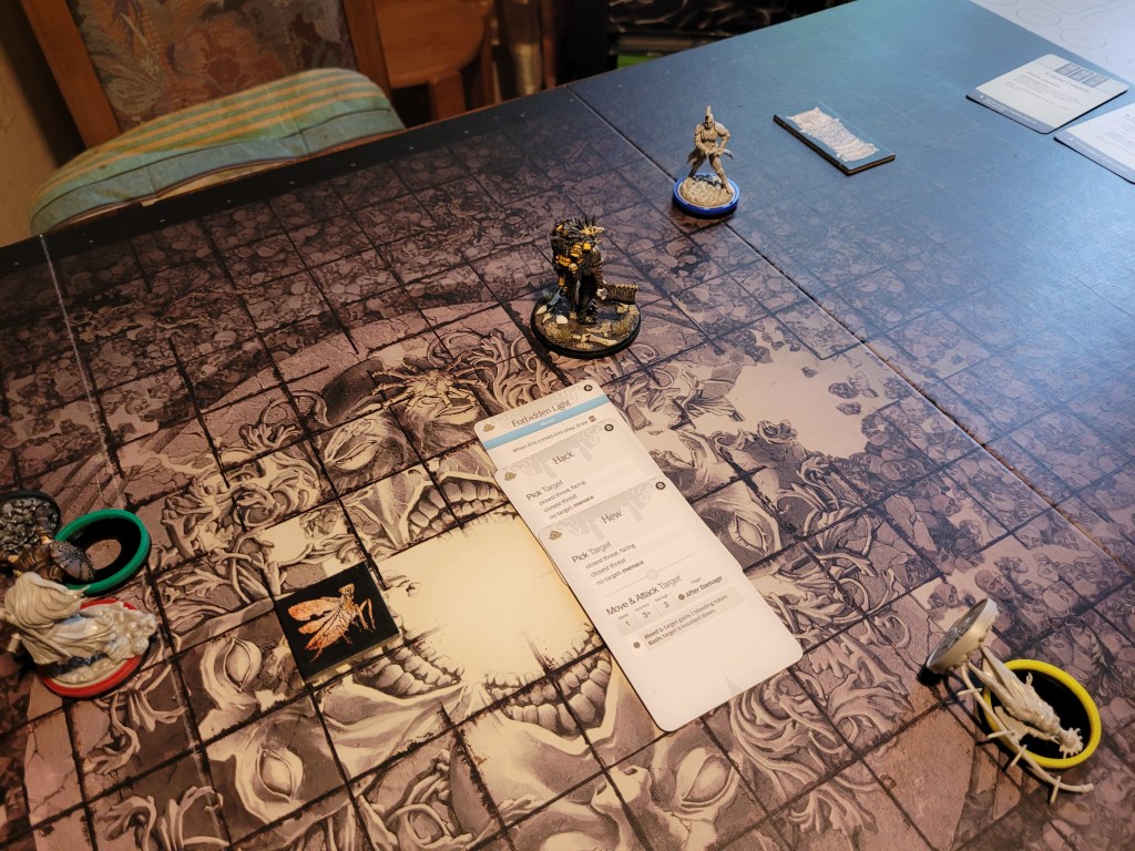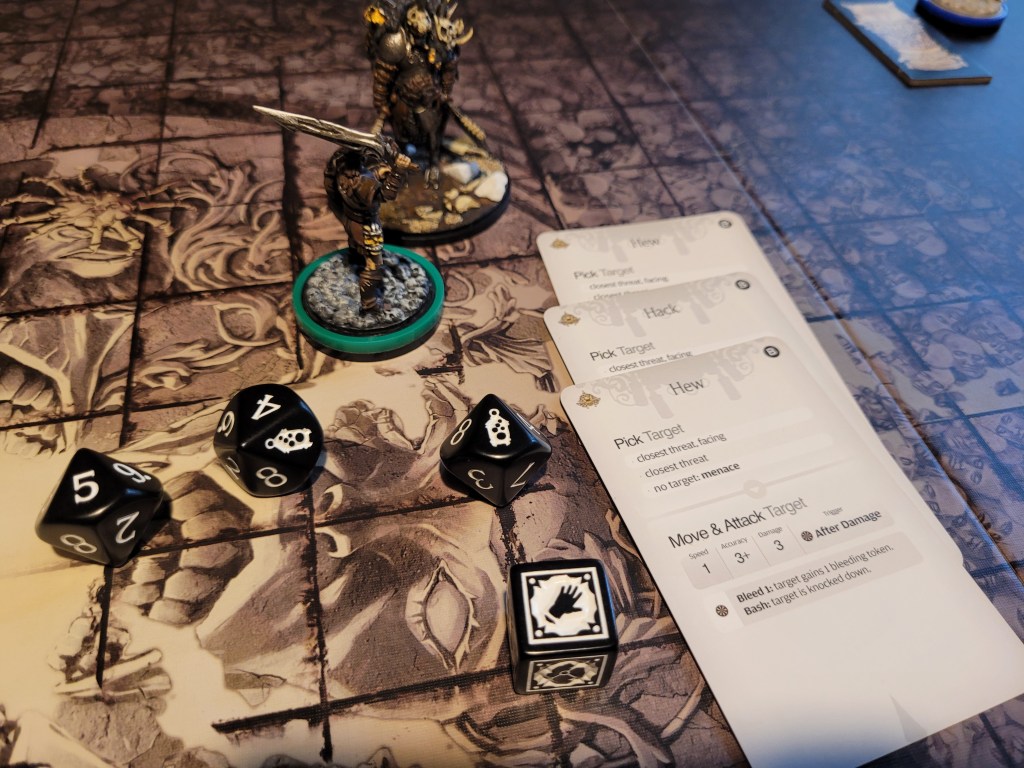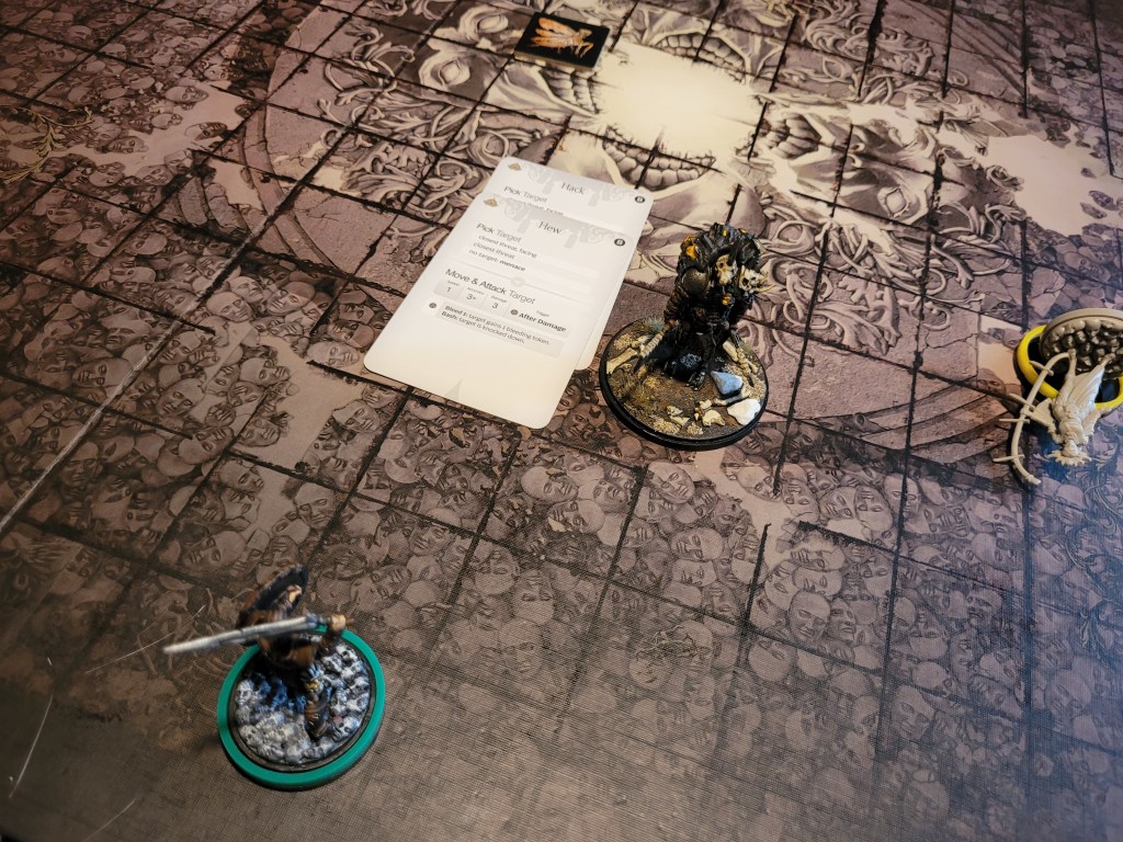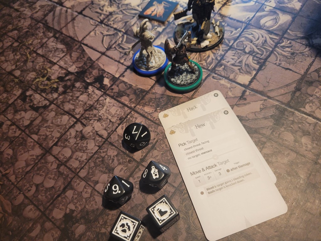Before he Charged in, he spent 2 survival for Overcharge and Embolden afterwards, to get Devastating 1, and then he hit 3 times on 4+. Two hits of which were perfect, so he was able to deal 1 instant damage with Katana specialization. One more hit was deflected off of the Cleaver before he could deal a double wound on an actual hit location. Invincible was merciful on this first activation of the fight.