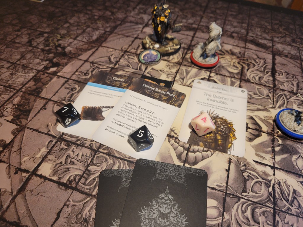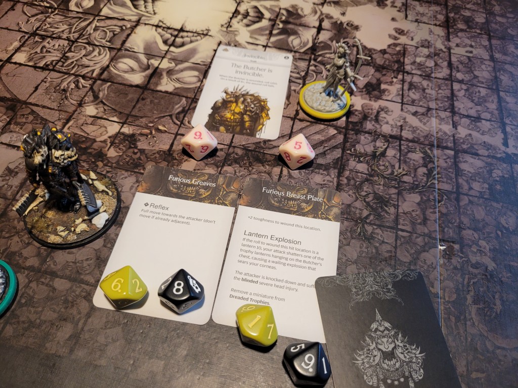 Other than Invincible we are facing a standard Butcher with +2ACC/DMG/SPD that will draw 3 cards per turn, shuffle its hit location deck and collect trophies from the people who die during the showdown.