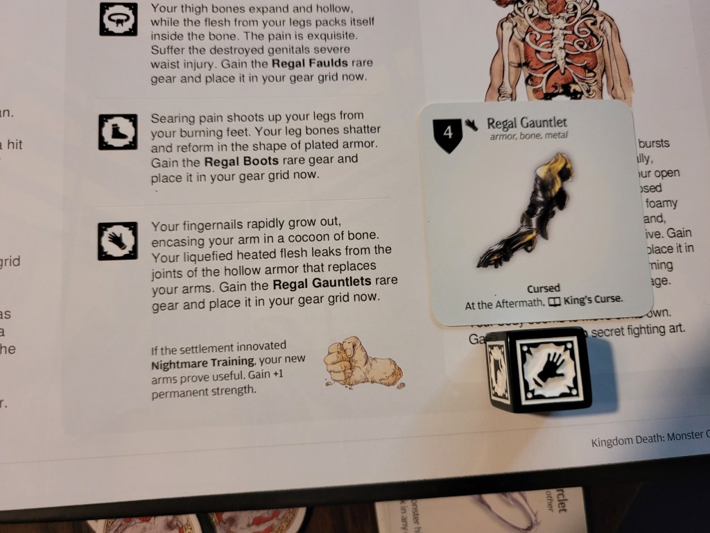 As for rewards we got 1 hunt xp, which aged Helios (+1MOV – he’s up to 7!), and weapon proficiency. Apollo got to take a chunky 3 points for axe, which made him a specialist of his own right. Rolling on the table we also got an OG Butcher Cleaver and a singular Broken Lantern and NO Forsaker Mask.