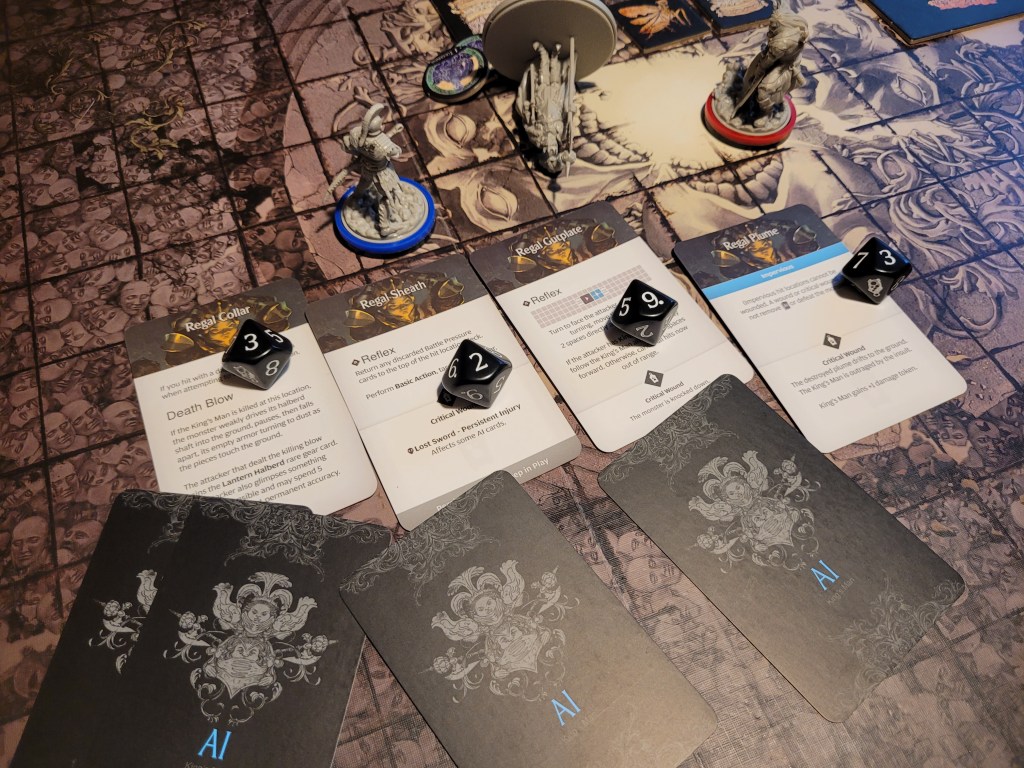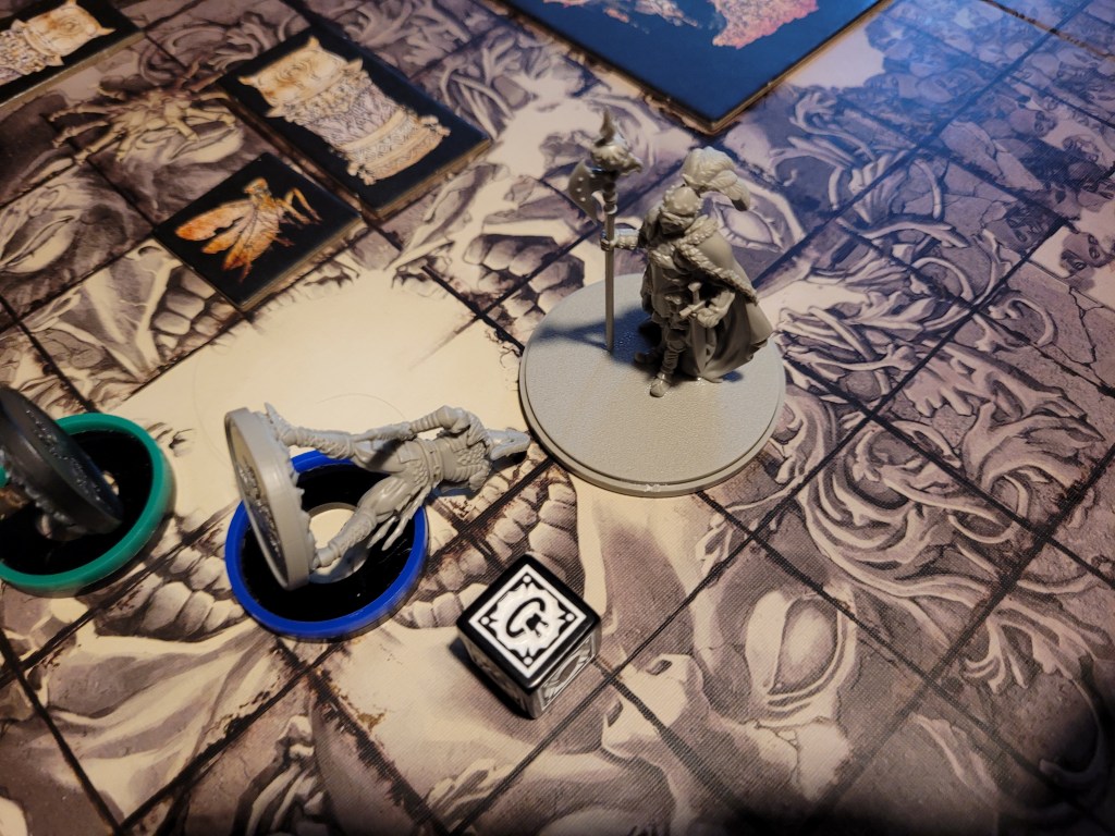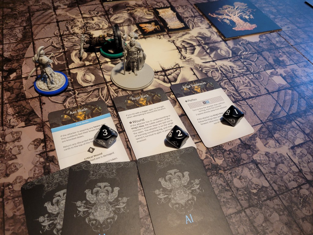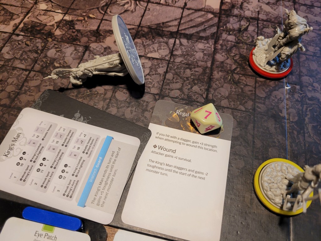 Only 2 cards left in the monster’s deck, Lash Out was put into play, a mood that would trip all survivors that got too close. This played Hook and Pull as well – the last card in the deck. Phoenicia was still far enough away to be a valid target and the King’s Man turned to Muzashi. 3 of 5 hits connected with Muzashi’s chest and he had to dodge one of them to not suffer a severe.