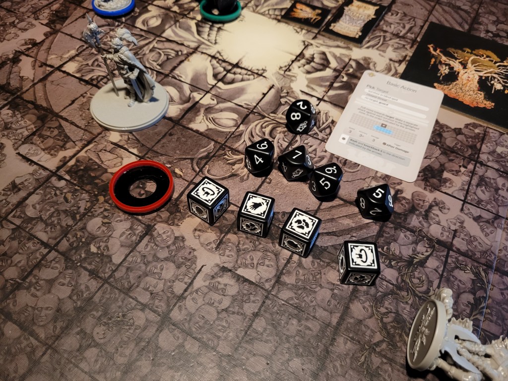 Phoenicia had King’s Step (SFA) because of the Regal Plackart. She also had Range 9 and we set her up so she could shoot the monster from where she started on the board. Hitting on 3+ she landed the arrow, unfortunately it was the Halbert Spear and the discarded Battle Pressure immediately returned to the top of the deck. Still, with Overcharge active she dealt 2 wounds to open the fight.