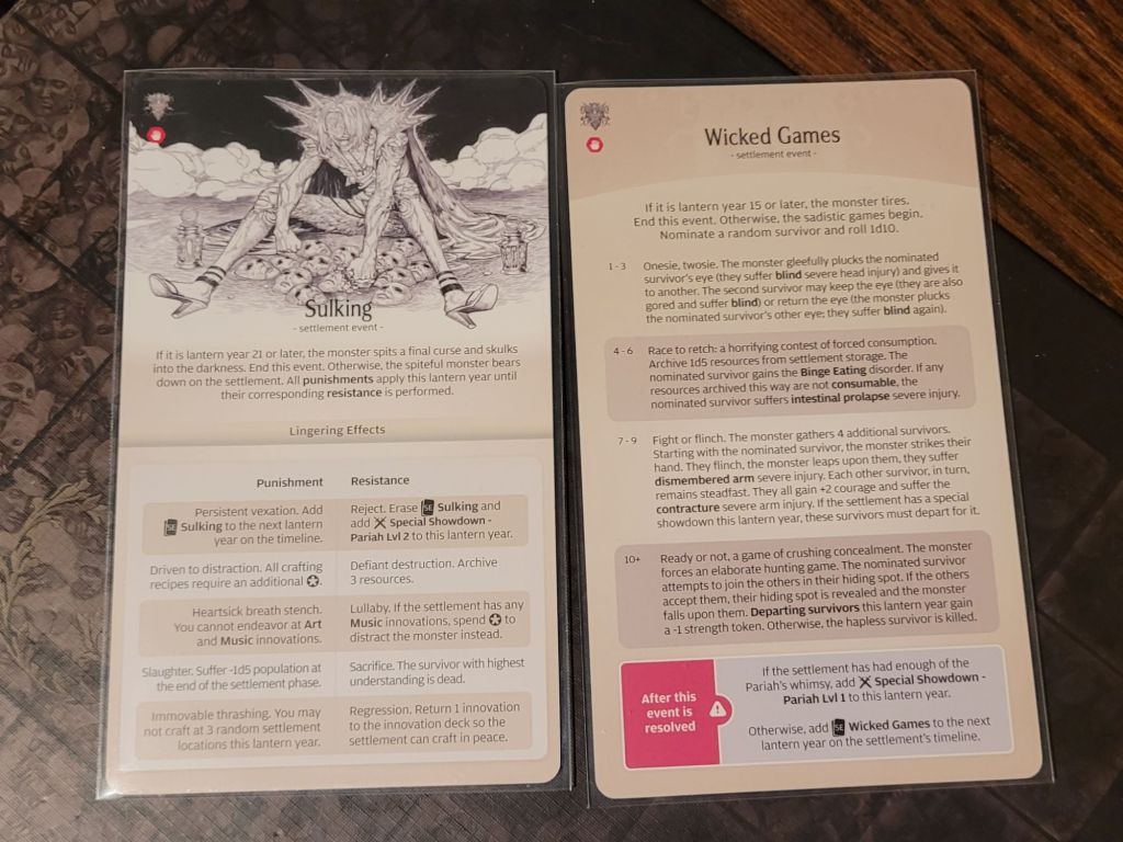 This feels a bit like a conspiracy theory, which is why I am putting this at the very end – between the keen cards, the monster wanting you to turn your survivors into weapons and all the possible punishments on the Settlement Events – I think, if we get a guaranteed Intimacy trigger with the Oblivion Mosquito or in the Inverted Mountain campaign a la Sacred Water for PotSun, the Pariah might actually favor Protect the Young.