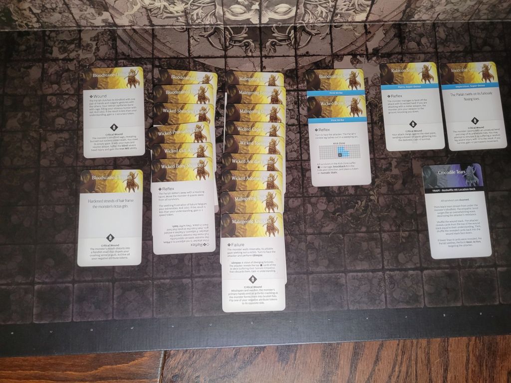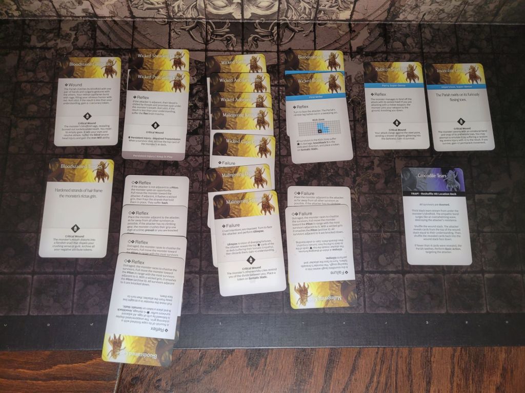 The Hit Location deck consists largely of Failure reactions (not quite half) and it changes slightly in the Lvl3 fight once the Pariah travels up the side of the Inverted Mountain and the survivors have to fight it whilst hanging from the ceiling (including its own – different – Scramble to Survive event going off anytime you are knocked down).
