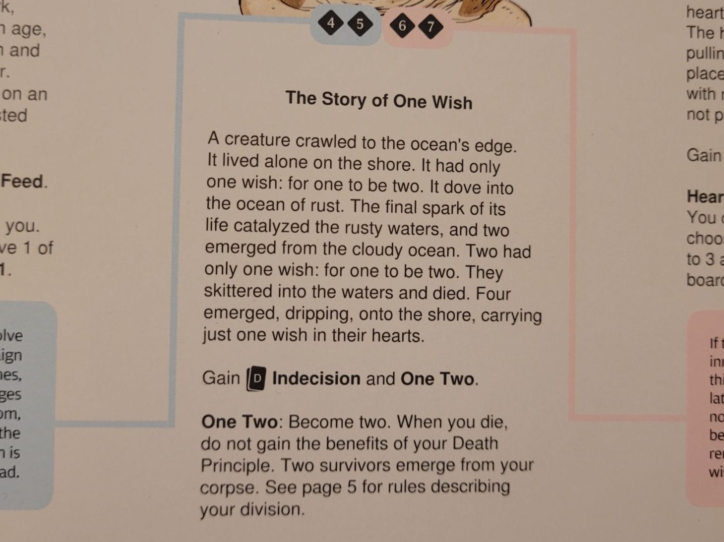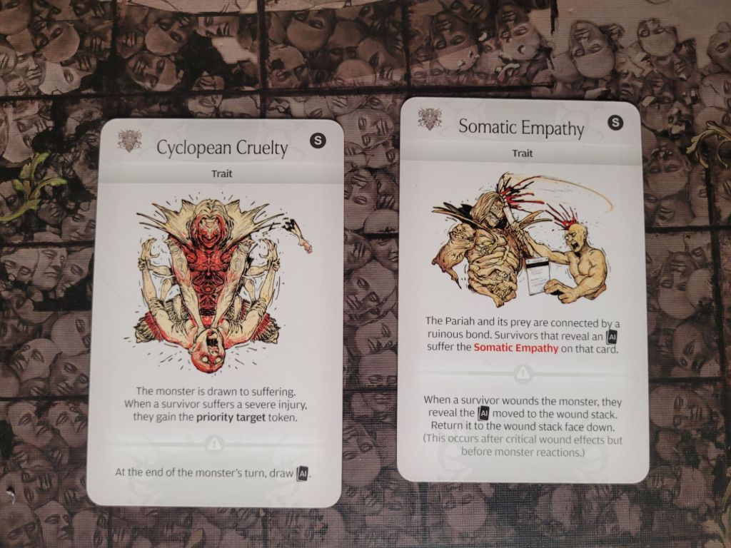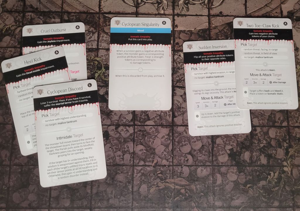 The monster will typically switch up its reactions between cavorting away from attackers and trying to give them glimpses of forbidden knowledge to further your understanding (+1), which in turn will not only make them more susceptible to the Pariah’s gifts and events, but also hits them with another draw for Cyclopean Empathy.