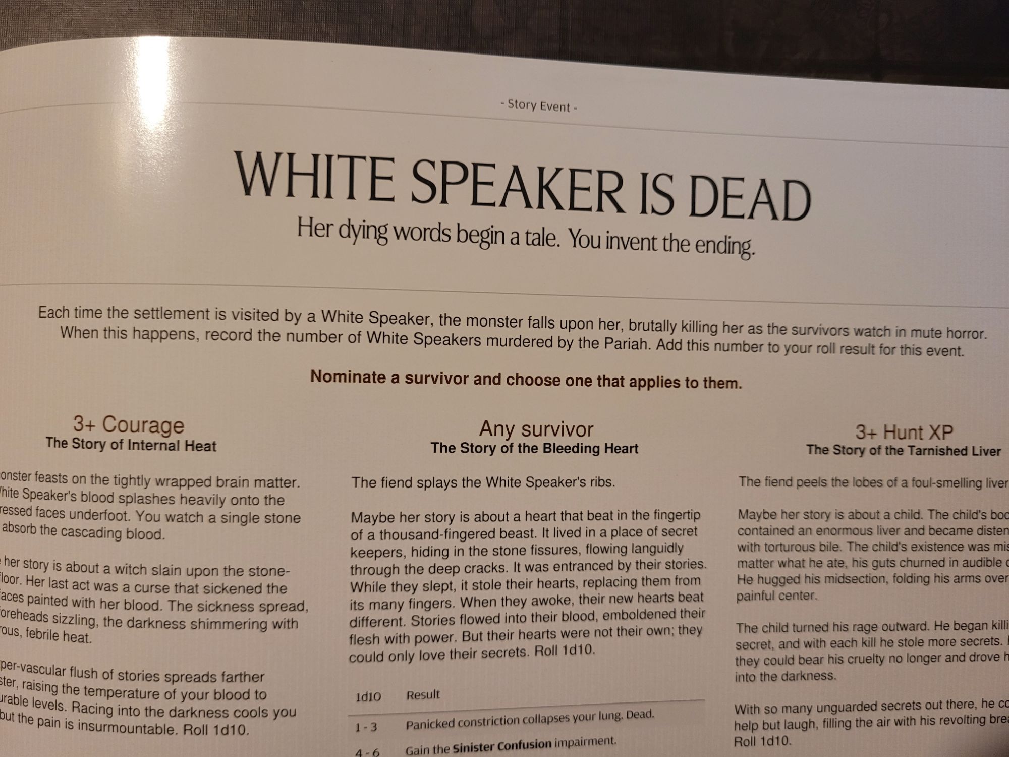 When it comes to the 6 stories explicitly mentioned across the Pariah expansion we are even deeper in speculation territory. And I also think it is important to keep in mind that the Stories shared with Survivors in Dark Secret (Felled Folly, One Wish and Heart’s Love) are complete, whilst for White Speaker is dead, the Survivors “invent the ending”.