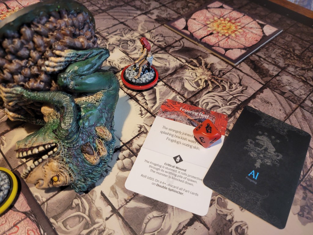 It will also perform Gaseous Bloat ever so often on other cards, which puts Fart cards onto Double Sphincter – which in turn activates these cards at the start of the monster’s turn. Obviously, we do not want that. Luckily wounds dealt to the Frogdog from the Heinous Origin – the center space of its blind spot – remove Fart cards in line for activation.