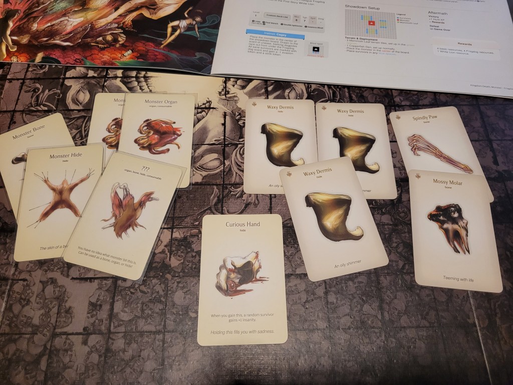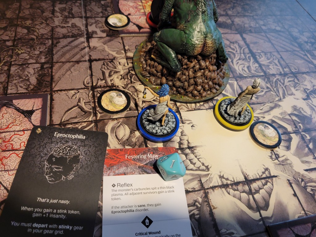 3 cards remaining, Just A Taste, again. The monster was not content with just one lick, 2 more hits went to Ellaine, and she finally suffered a Brain Trauma as the monster tried savoring a meal to come. Ellaine rolled lunacy which wasn’t an insta-kill for a change. She got Rageholic as her disorder and 5 insanity.