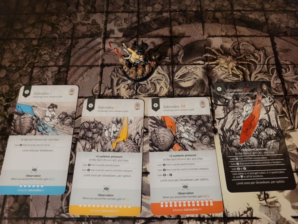 Meanwhile her Knowledge Adrenaline gives her more and more extra activations and movement to spend the further you can level it up. Which she does by wounding monsters.