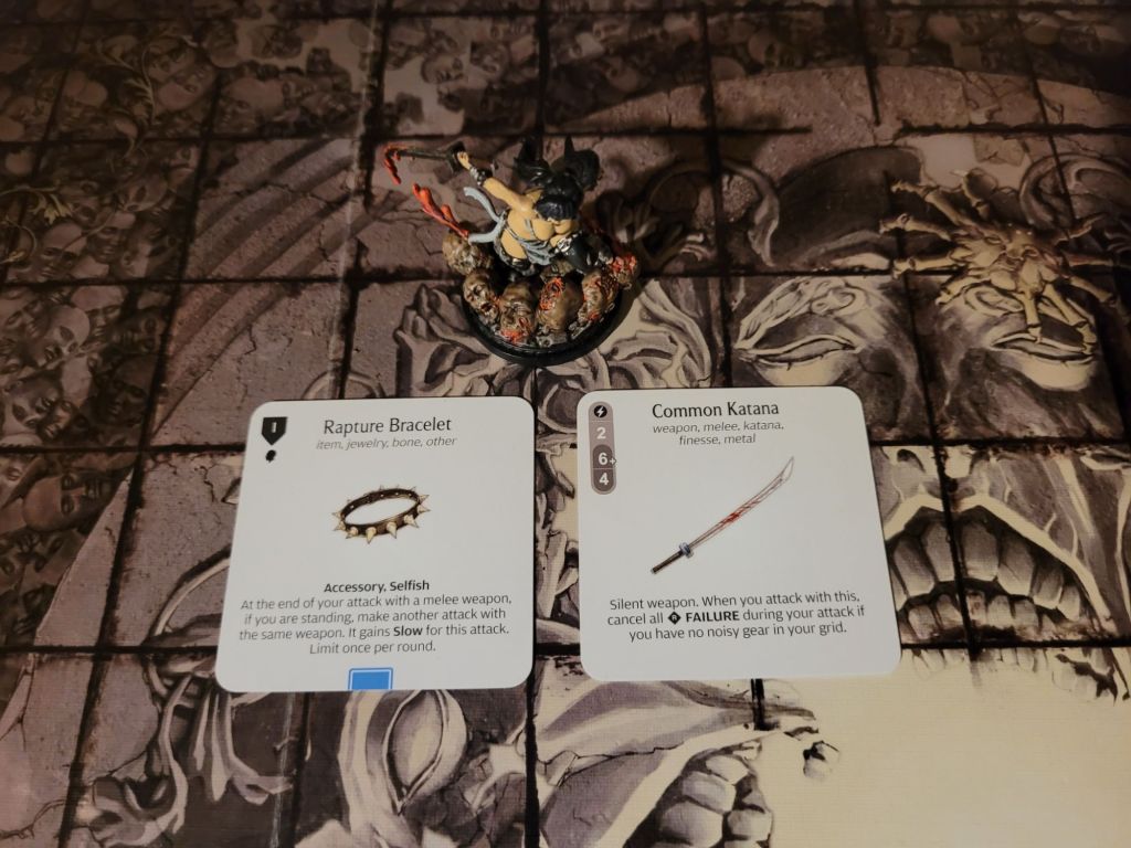 And her weapon of choice is the Common Katana (2/6+/4), which in addition to being a Katana – Sun-lovers rejoice – and having a decent statline for an early weapon, also turns off all Failure reactions on monster Hit Locations if you have no noisy gear in your gear grid.