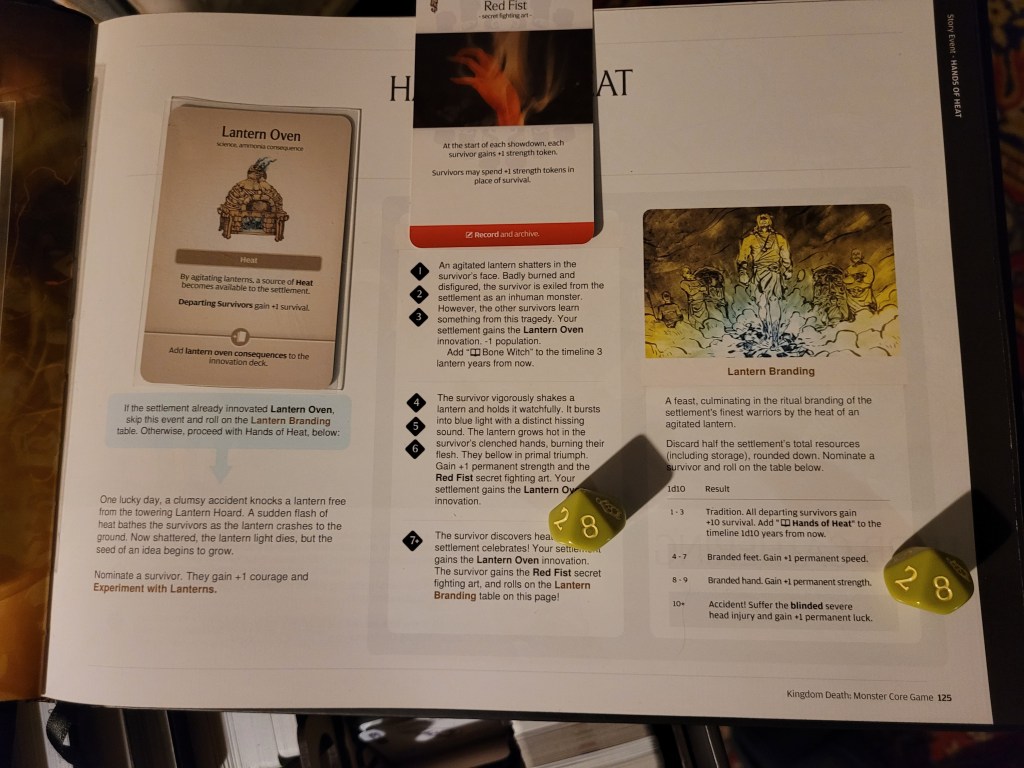 Rex was nominated to Experiment with Lanterns and he rolled a little too well. We gained Lantern Oven (I) for the settlement, he learned Red Fist (SFA) and unfortunately, we also had to roll on Lantern Branding for him – another 8 – another +1STR for young Rex.