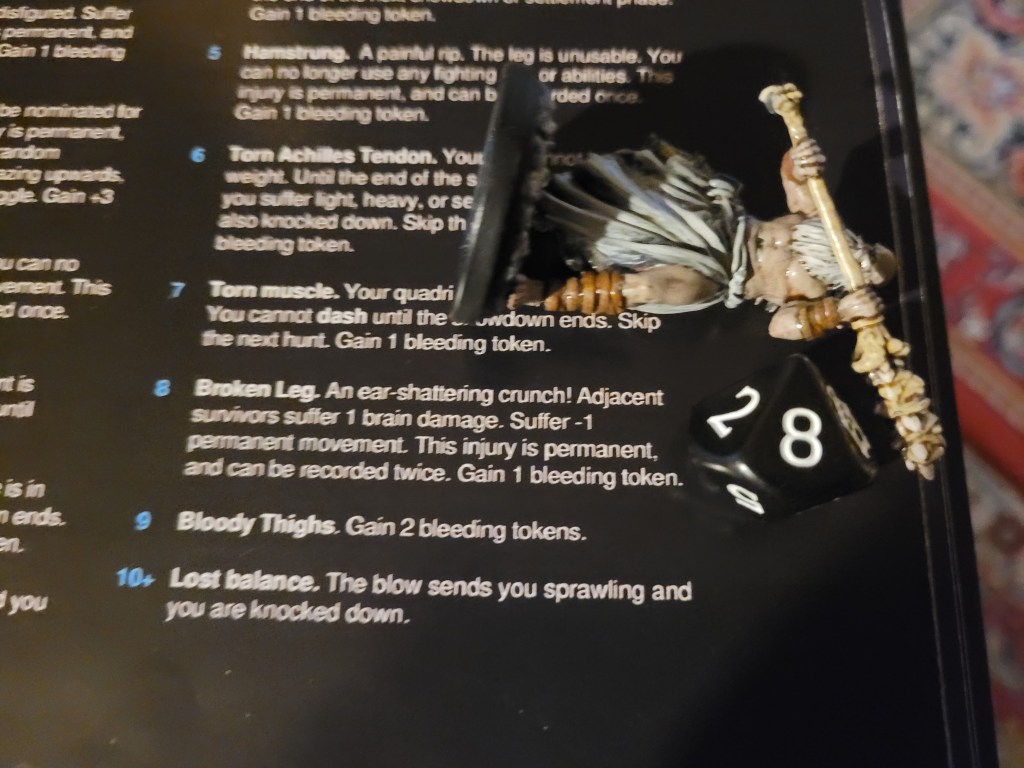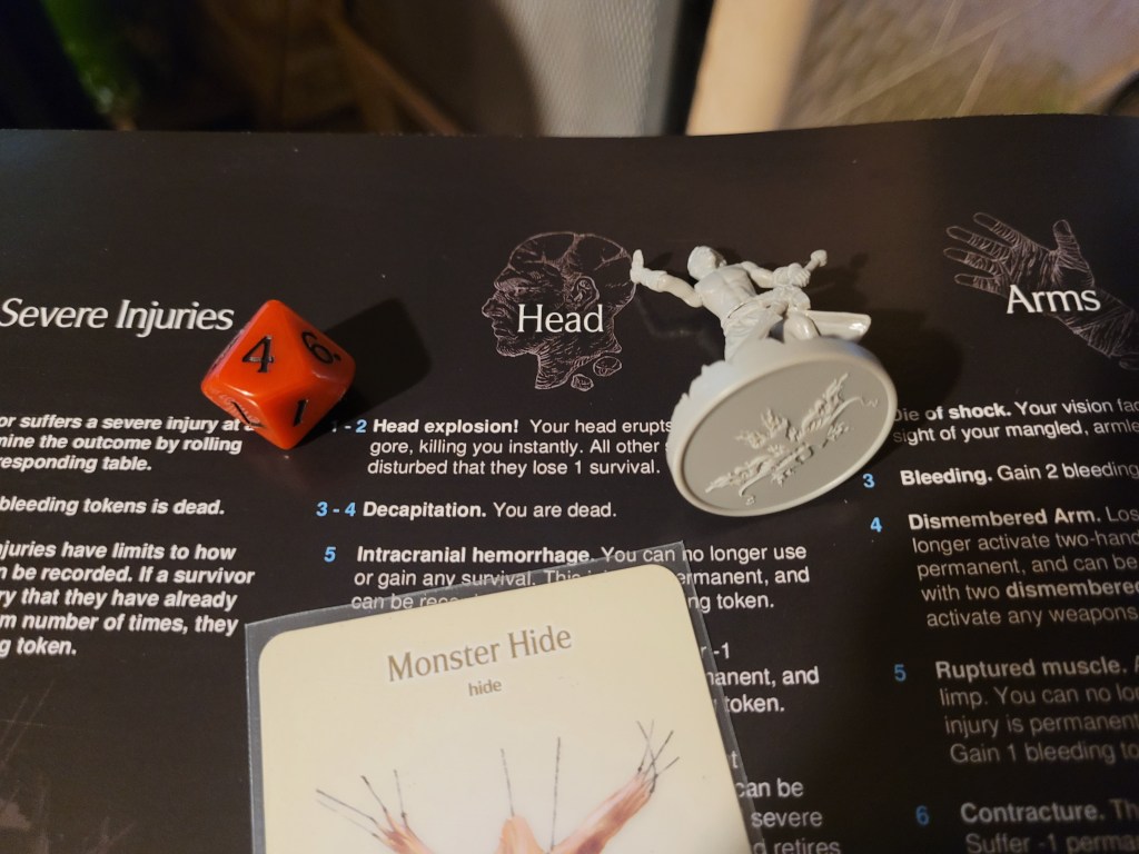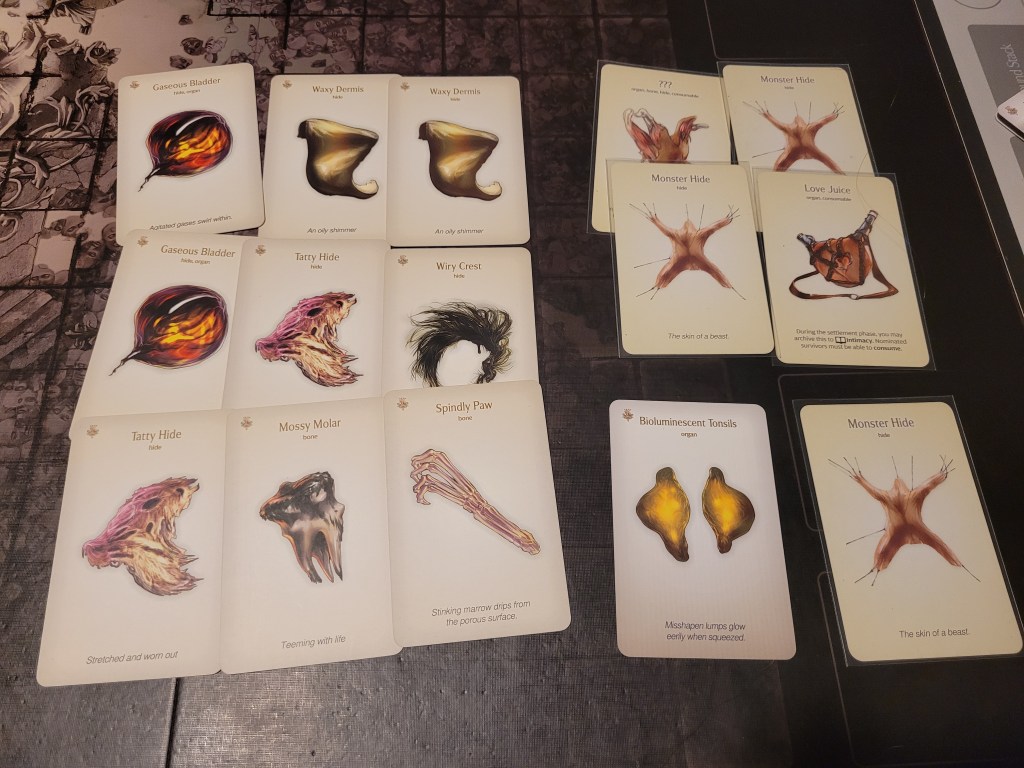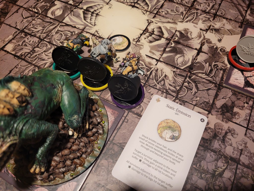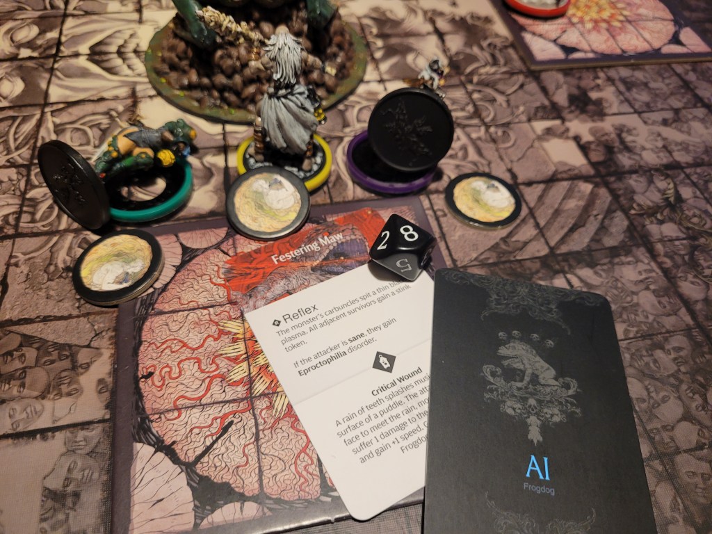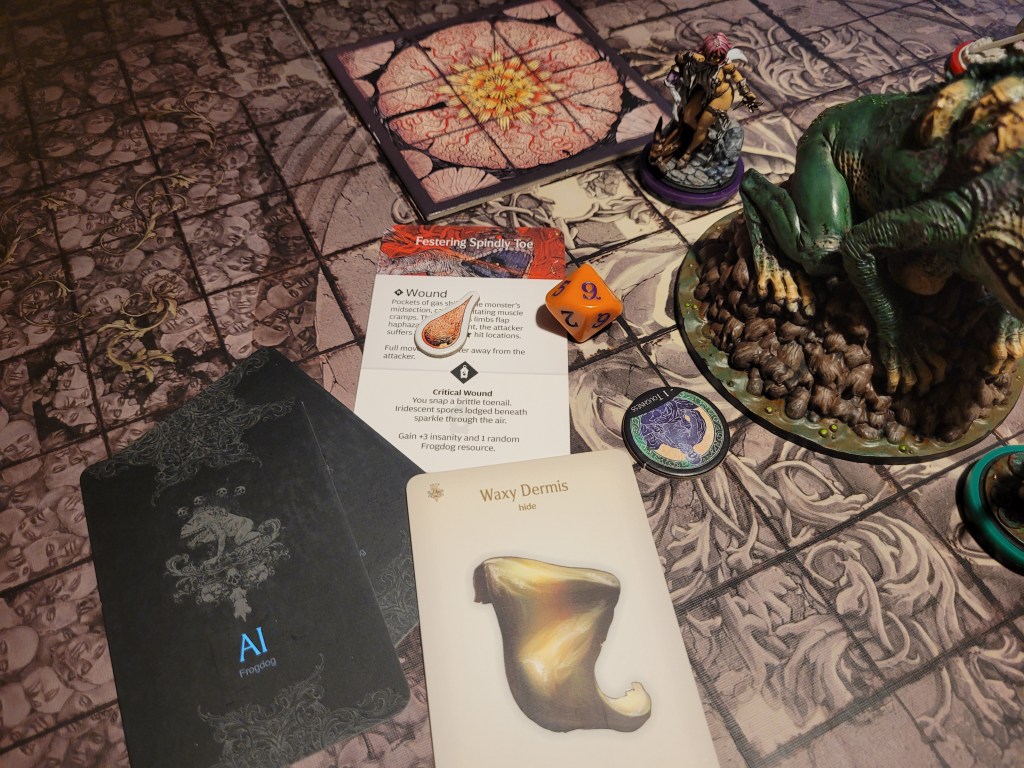 Candy then started our offensive push. First off, she did spend 2 survival to remove Coprolalia (D) to make an early observation before she attacked – this was a costly investment, but at the time I felt confident about it. She hit the monster once and trying to avoid the wound reaction, she took a bleed-token to turn the wound into a crit. Overall a great choice, with the heel being savage, and we got a Tatty Hide as well for hacking off the Festering Spindly Toe. I considered briefly if I should feed the resourse to Cola but held off.