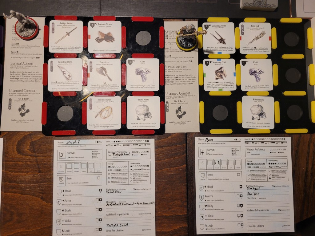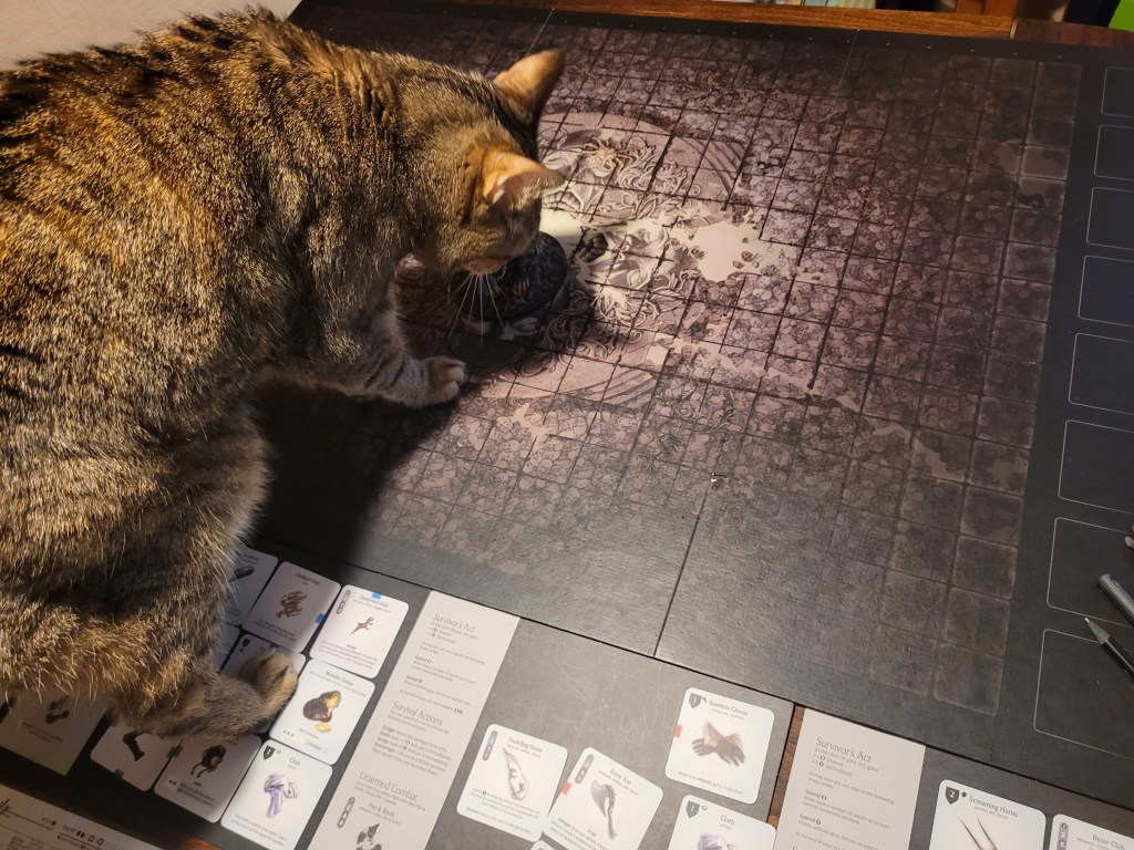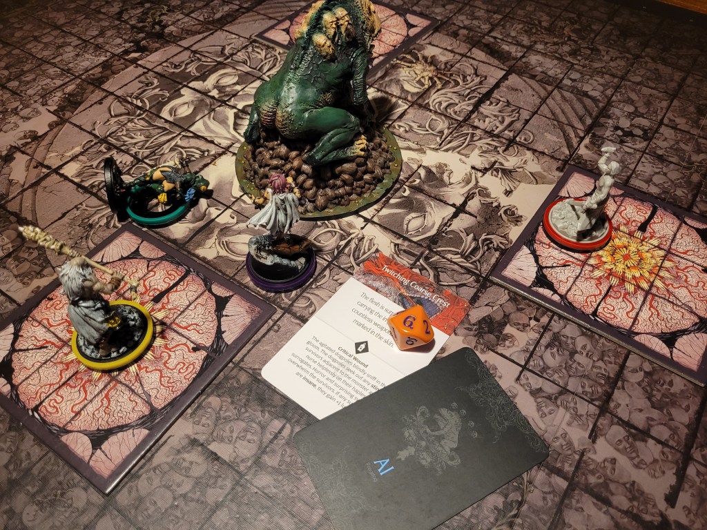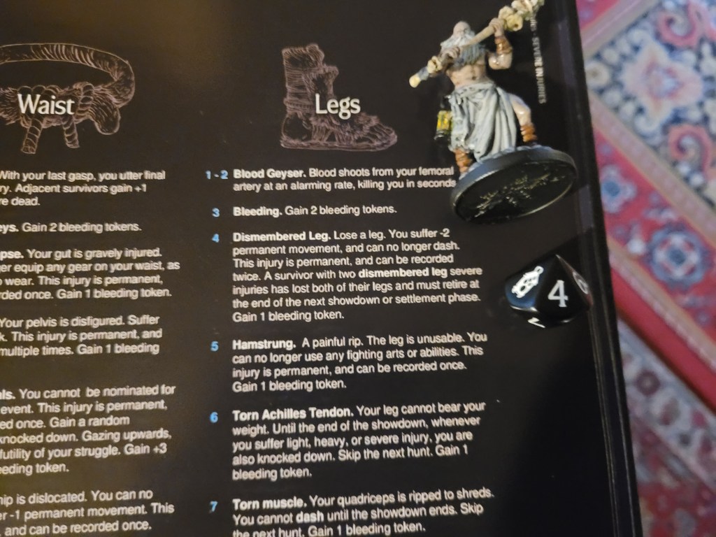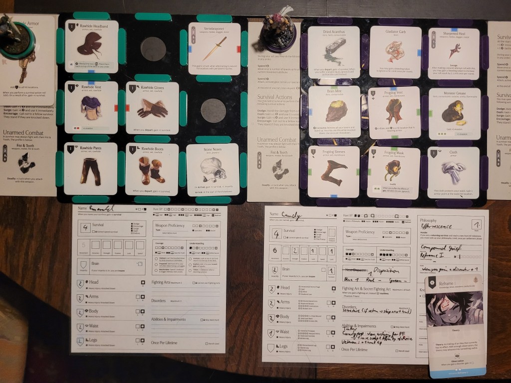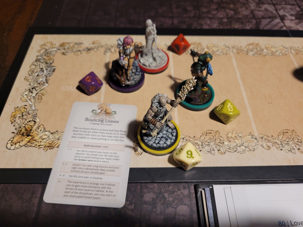 Candy then started our offensive push. First off, she did spend 2 survival to remove Coprolalia (D) to make an early observation before she attacked – this was a costly investment, but at the time I felt confident about it. She hit the monster once and trying to avoid the wound reaction, she took a bleed-token to turn the wound into a crit. Overall a great choice, with the heel being savage, and we got a Tatty Hide as well for hacking off the Festering Spindly Toe. I considered briefly if I should feed the resourse to Cola but held off.