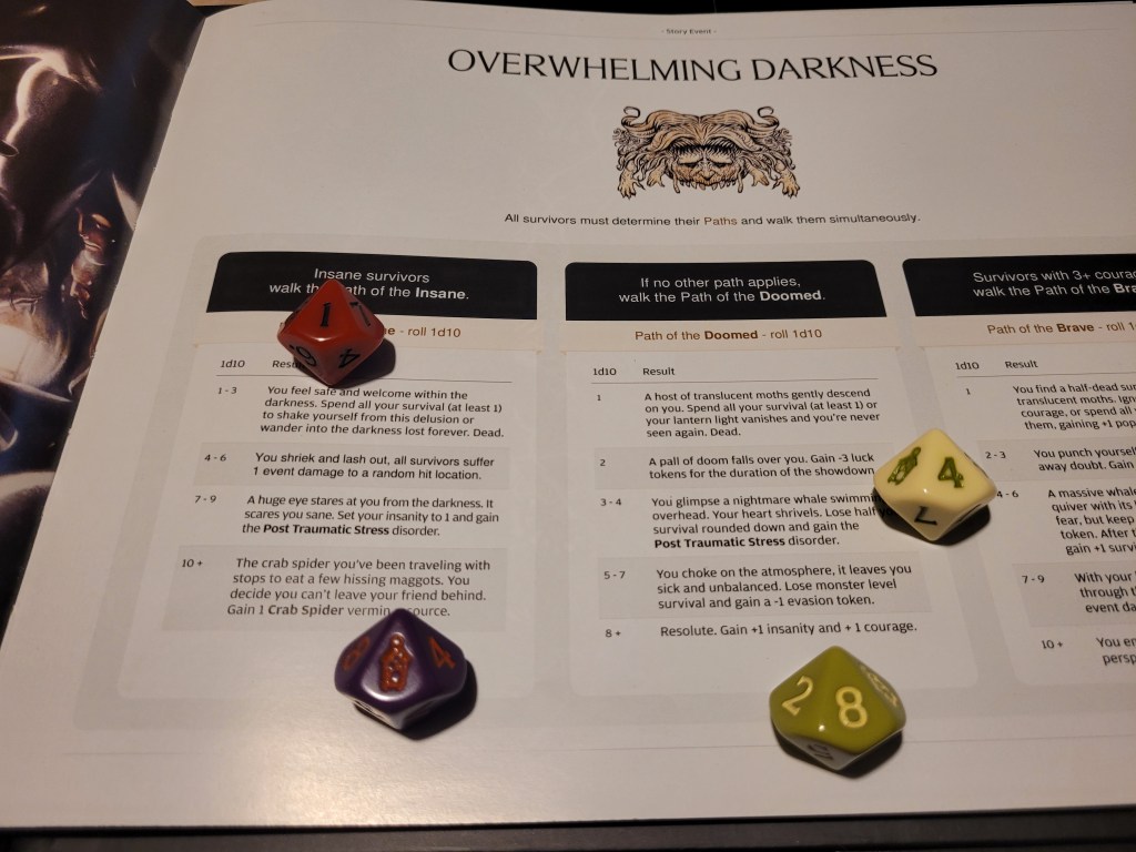 Hurting only slightly we arrived at Overwhelming Darkness. Candy (PotI) managed to make a Crab Spider (V) friend, Manus (PotD) suffered PTSD, Marduk (PotI) lost all of his survival to not die, and Emerald (PotD) gained an insanity and a courage.