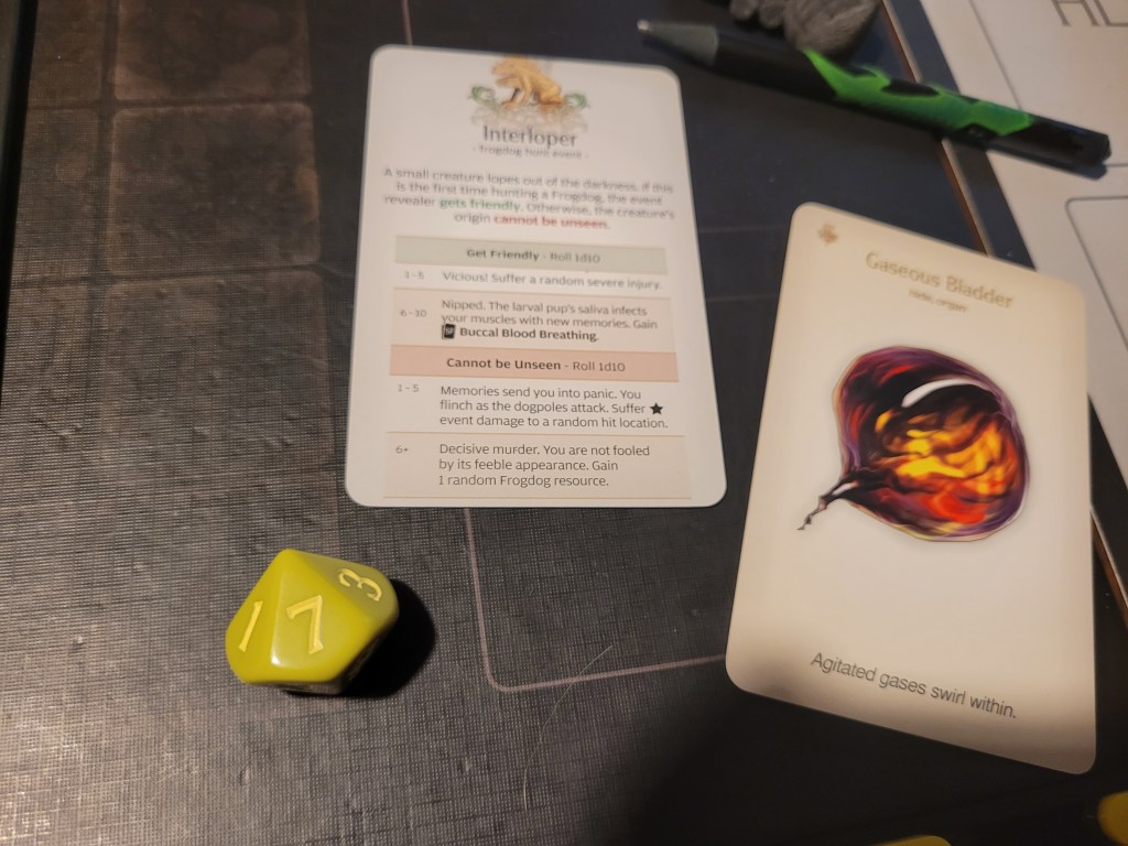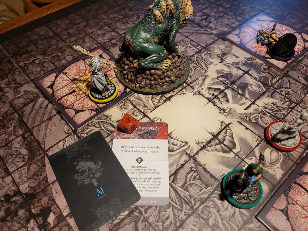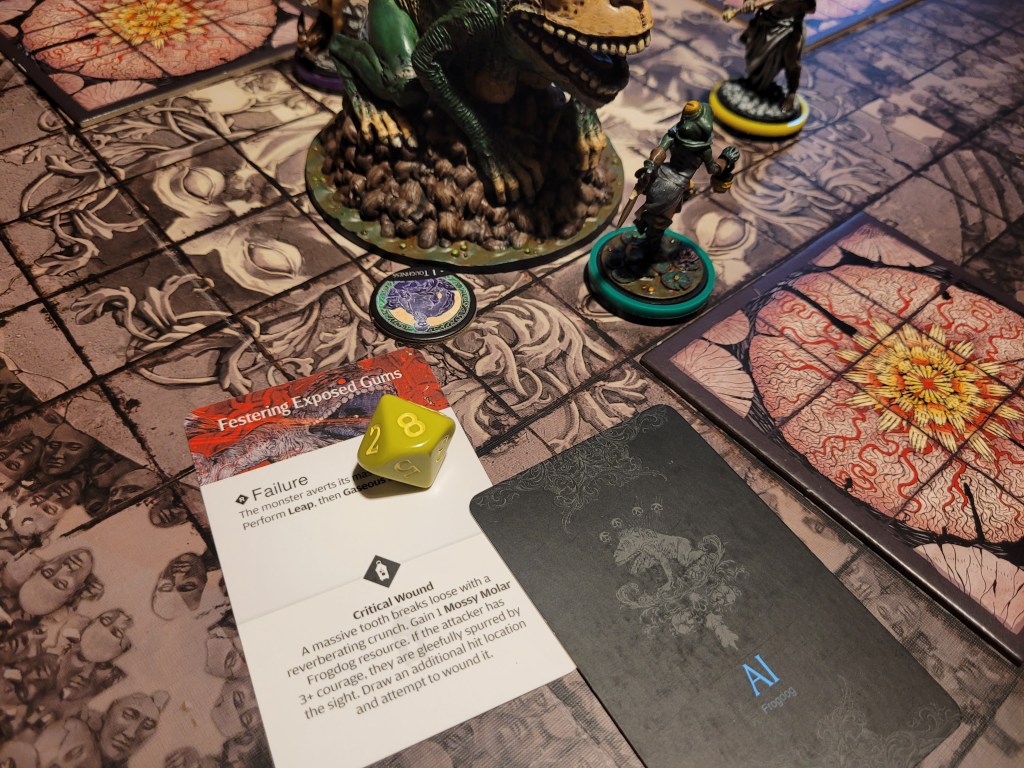 Wincing the monster was an easy target for Candy as she flung herself at the Frogdog’s side, her heel ready to carve away. (NB. I am unsure at this point who had encouraged Candy.) Again only 1 hit! But with another bleed-token (up to 3), she was able to turn the attack into a crit! 2 wounds dealt, and another Waxy Dermis gathered, Emerald spent her last STR-token to dash.