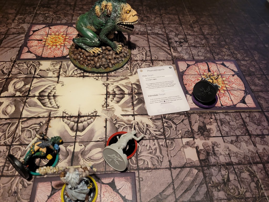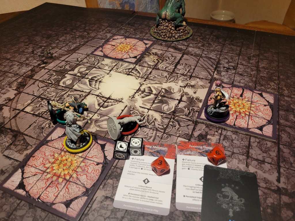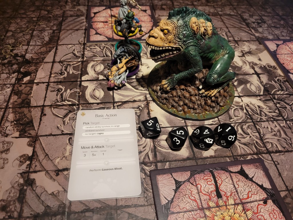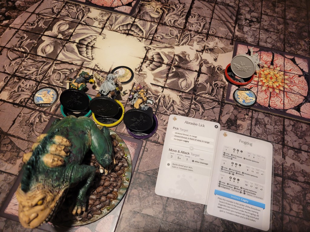 Manus, who could set up freely due to one of the hunt events, was in a position to use Slam and push the monster around – which he did, lowering the Frogdog’s TGH by 1 for the rest of the round.