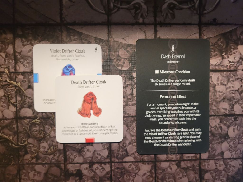 The only other gear the Death Drifter starts with is his Death Drifter Cloak. This is an irreplaceable item that lets you turn any one dice rolled for a Death Drifter Knowledge or Fighting Art into a 10 – once per round.