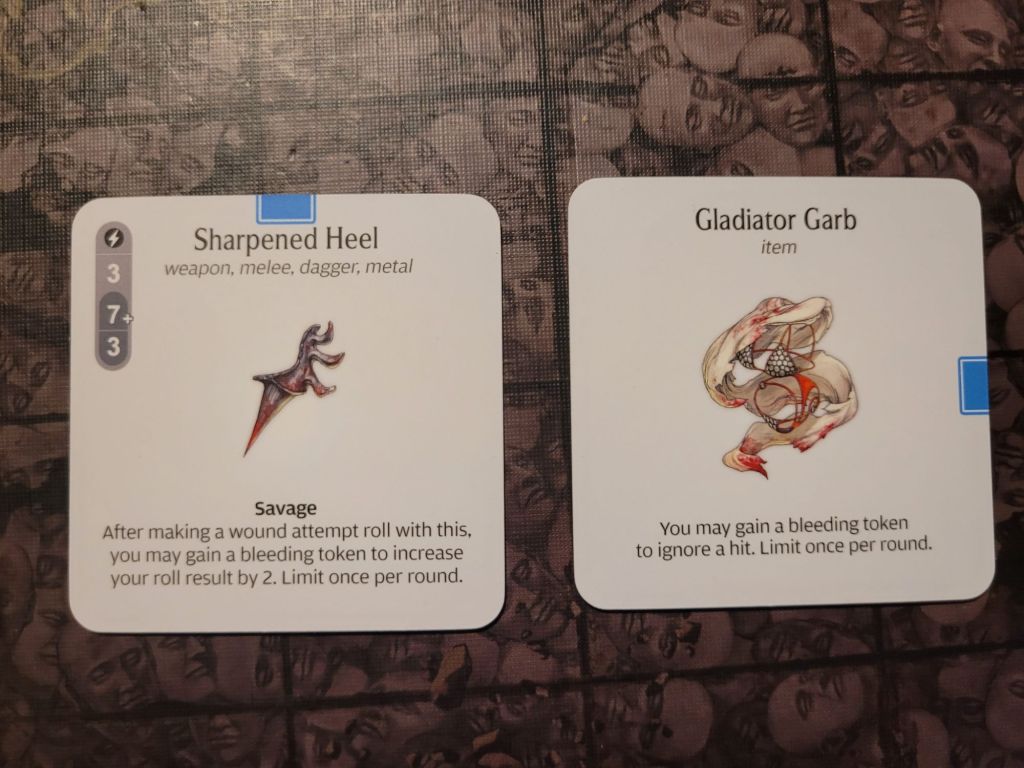 The Sharpened Heel is a 3/7+/3 dagger with savage and the ability to, once per round, take a bleeding token to increase the roll result of a wound attempt by 2. This is not just +2STR .. this increases the result of your roll – meaning she will be able to turn what would have been a wound into a critical!