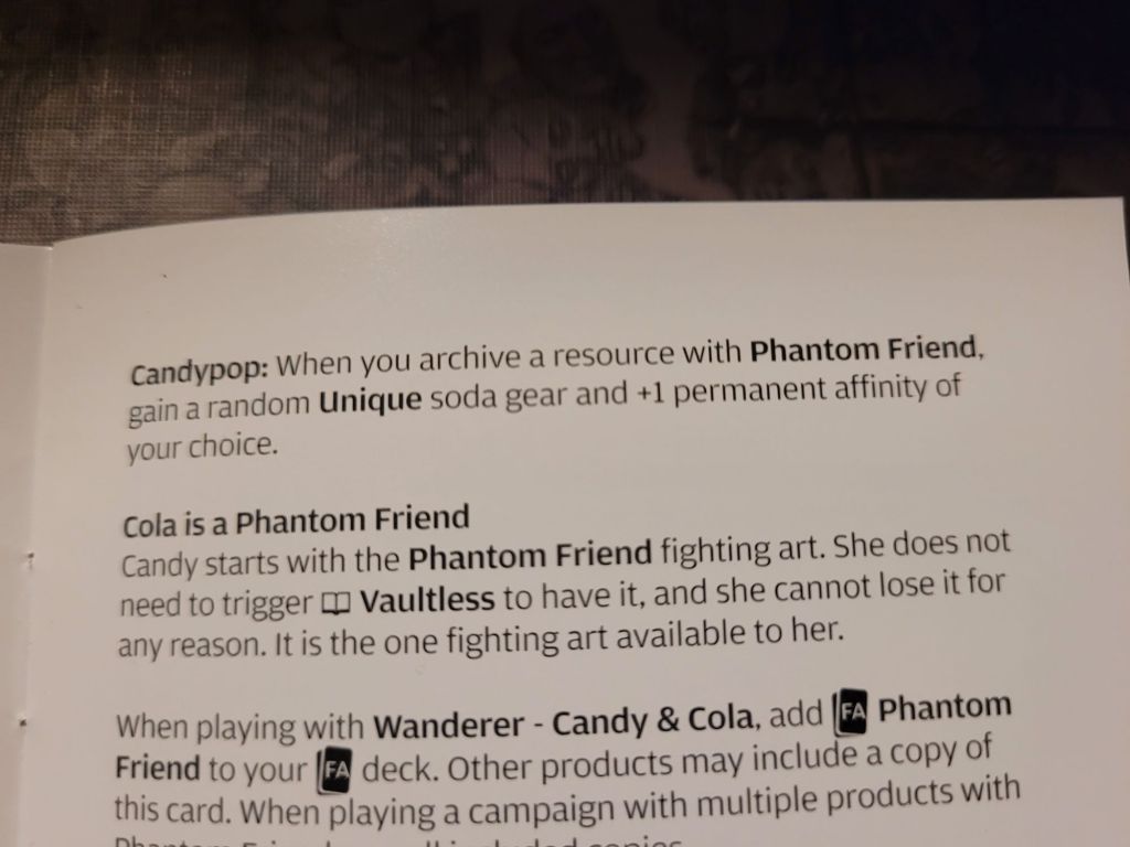 Candypop enables her to draw a random unique soda gear card and gain a permanent affinity of your choice when you archive a resource with Phantom Friend (FA). Obviously being able to stack extra affinities like this can be really powerful, even if it is just to activate a Monster Grease or Lucky Charm more easily! And with her extra LCK and the Sharpened Heel she uses as a weapon she should be dealing critical wounds to the monster on a fairly reliably basis as well, cutting off a Pelt or a piece of a Beast Steak to feed to her furry friend, Cola!
