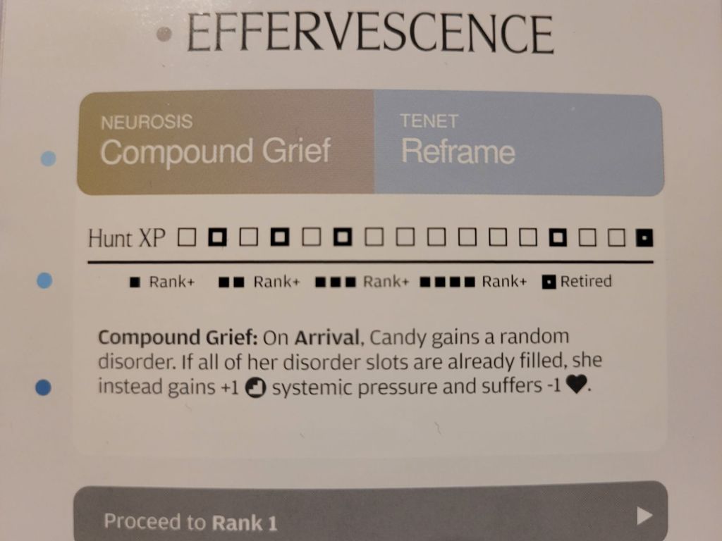 Whilst at first rank it only collects observations for gaining disorders (only twice, luckily) it will soon offer you a chance of removing disorders from Candy at the cost of 2 survival – which can be fairly expensive for this stage of the campaign. In turn this makes new observations for progressing towards Rank 3 by removing disorders as well. (Note also that it does not actually matter how the disorder is removed for the observation to be made at this rank.)