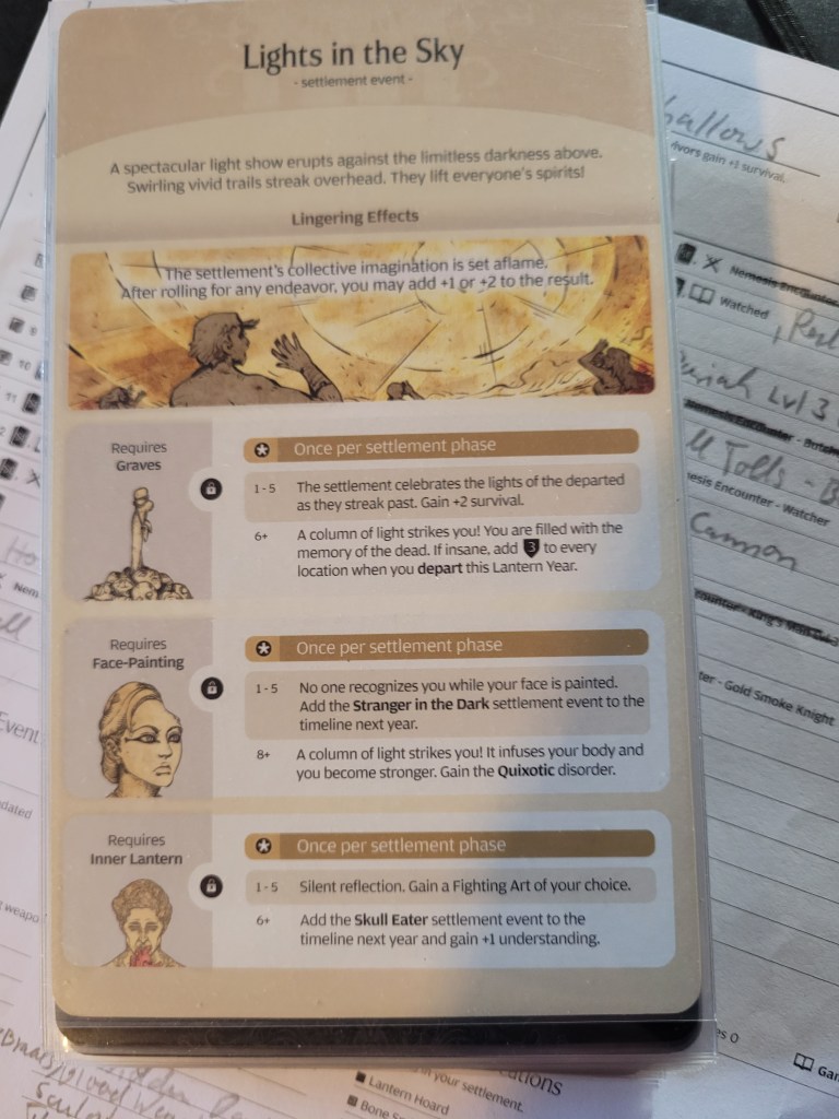 And so I quickly circled back around to Light’s in the Sky. We did desperately need some better weapons at this point, so I chose to spend the endeavor on the Inner Lantern interaction on the settlement event.