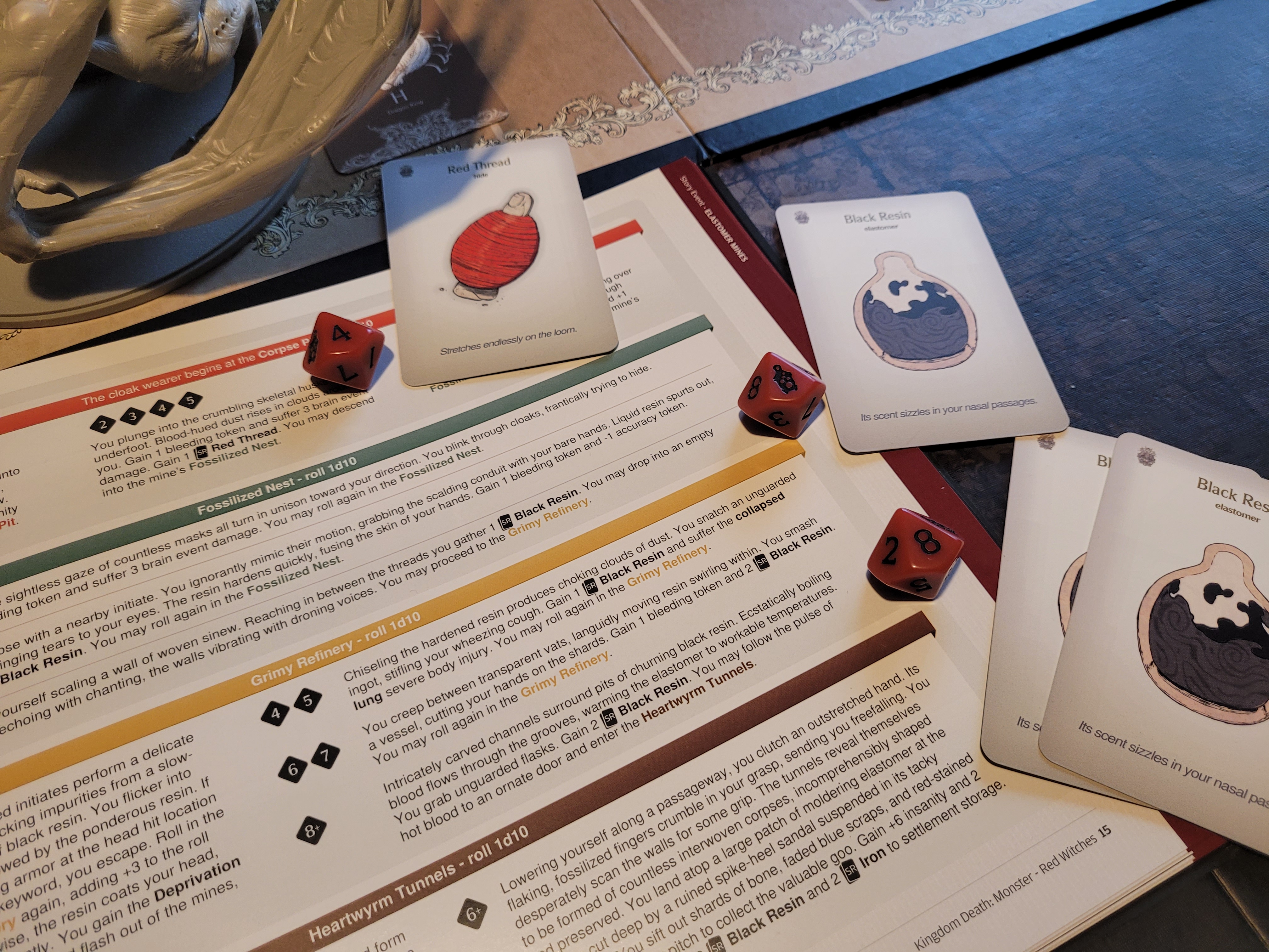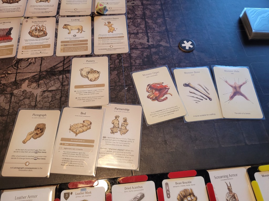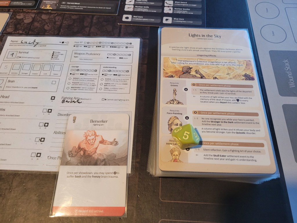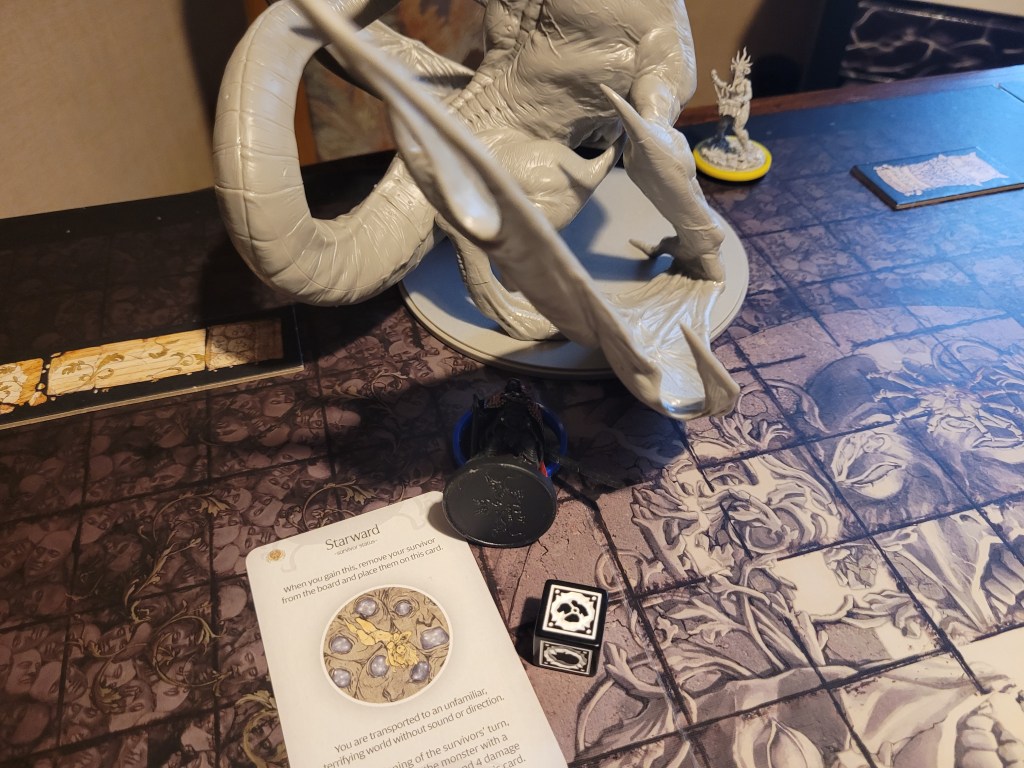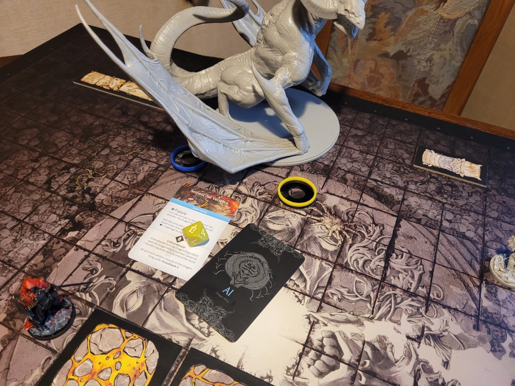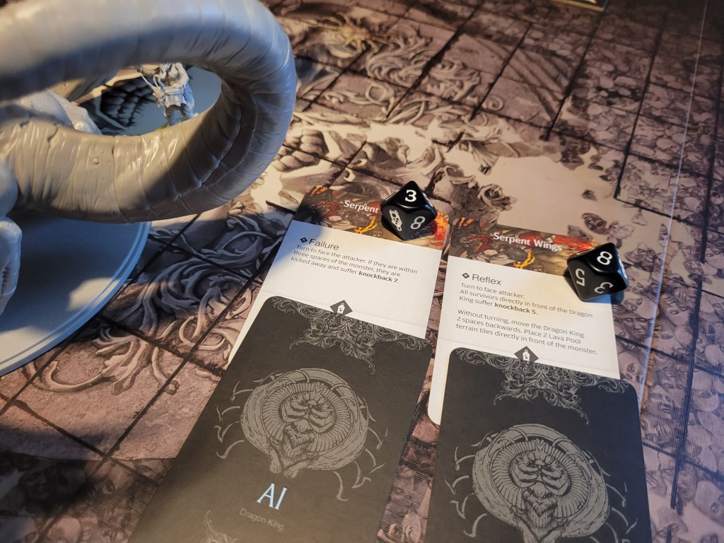 As we set up for the fight, Copperhead drew a tactics card and we got Black Guard Tactics, which did give all 4 of my survivors Honorable (D) for the duration of the fight in addition to any other disorder(s) they may have, but, once per round, if we attacked the monster from its facing we could gain 1 survival. Against the Dragon King, I figured this tactics card to be a decent draw.