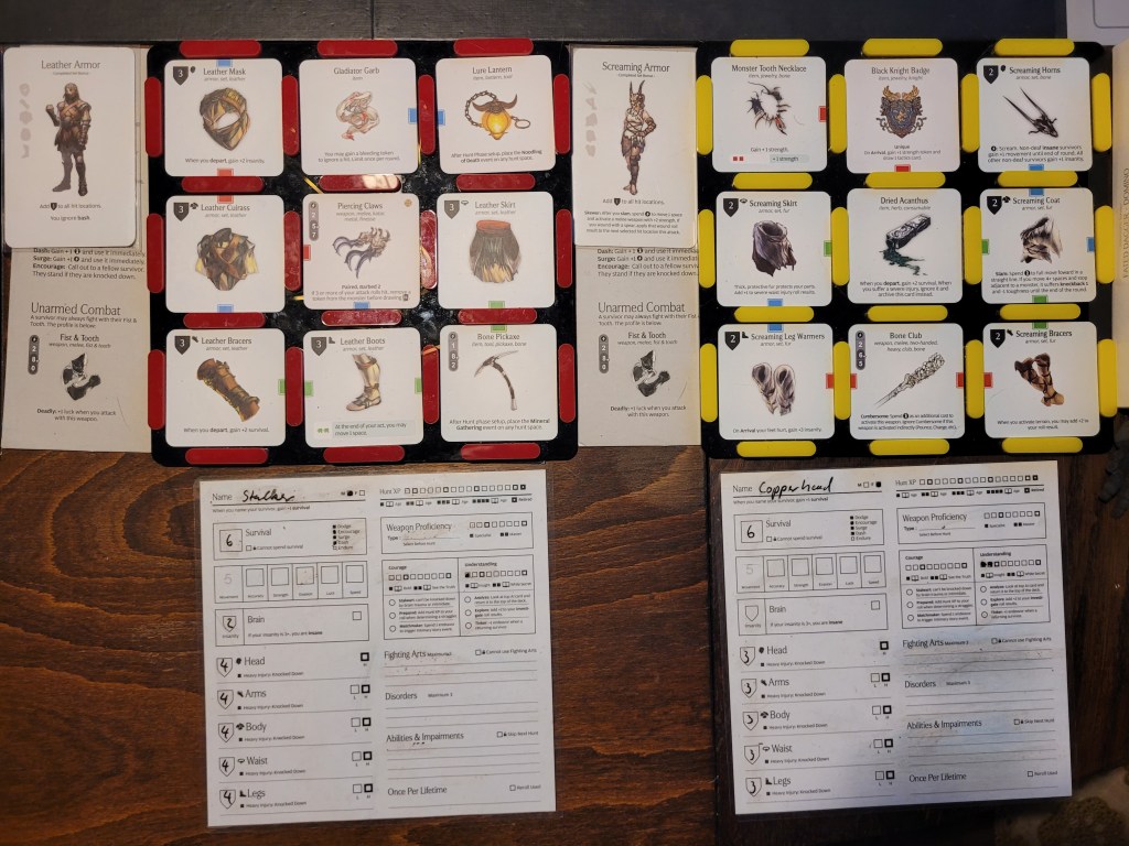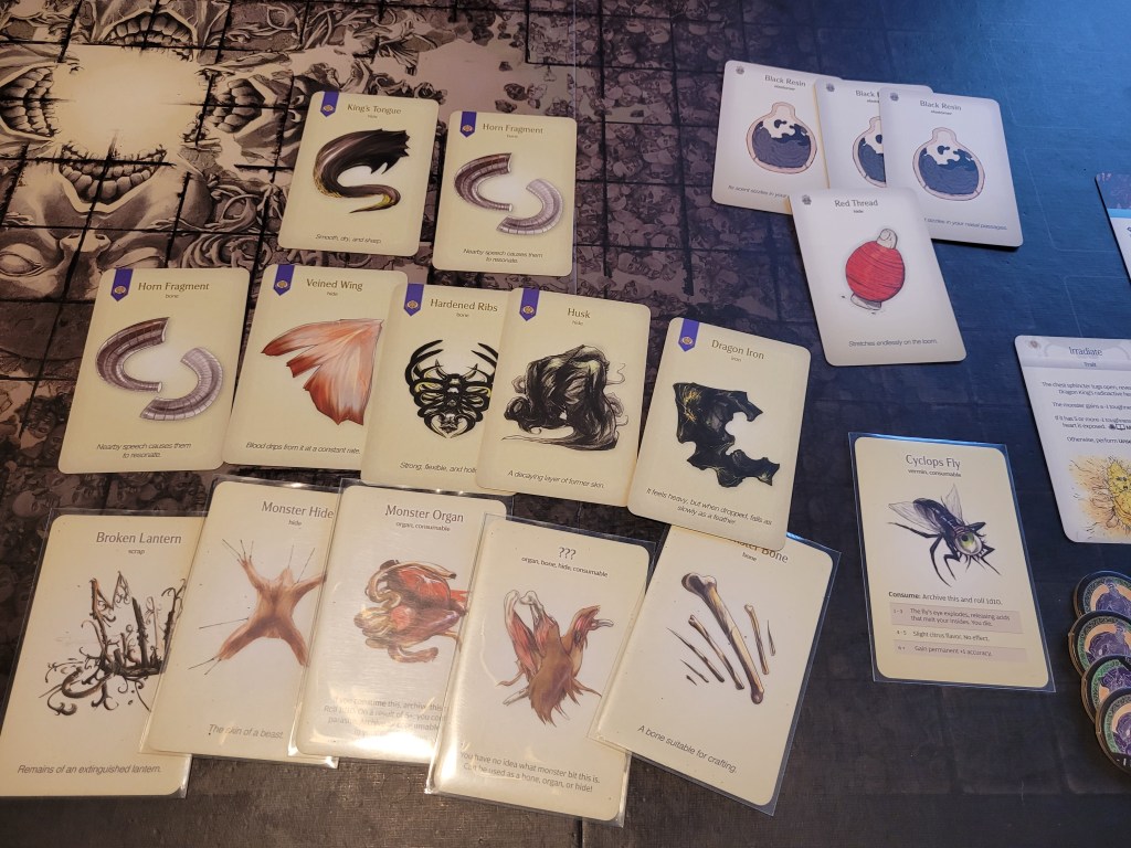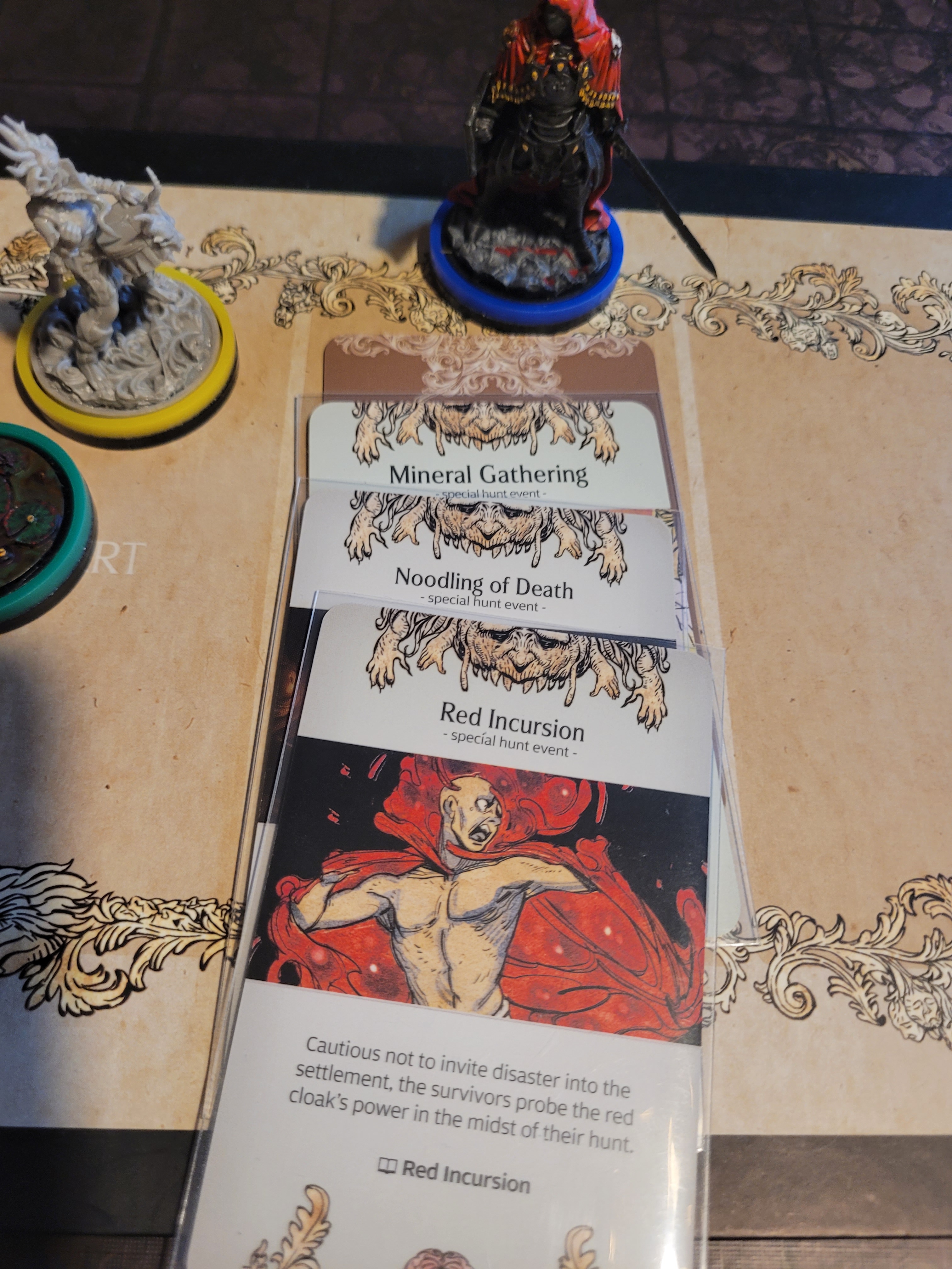 We started this hunt by piling up all the extra hunt events we could place on the first space and picking Red Incursion first. Frogdos proved to be somewhat of a natural at this as he managed to get into the mines (6) without any isusues. After collecting 1 Red Thread and 3 Black Resin he could have even entered the Heartwyrm Tunnels, but as he only had 2 armor at the arms, so I instead decide to back out and not risk dying to the giant mollusk.