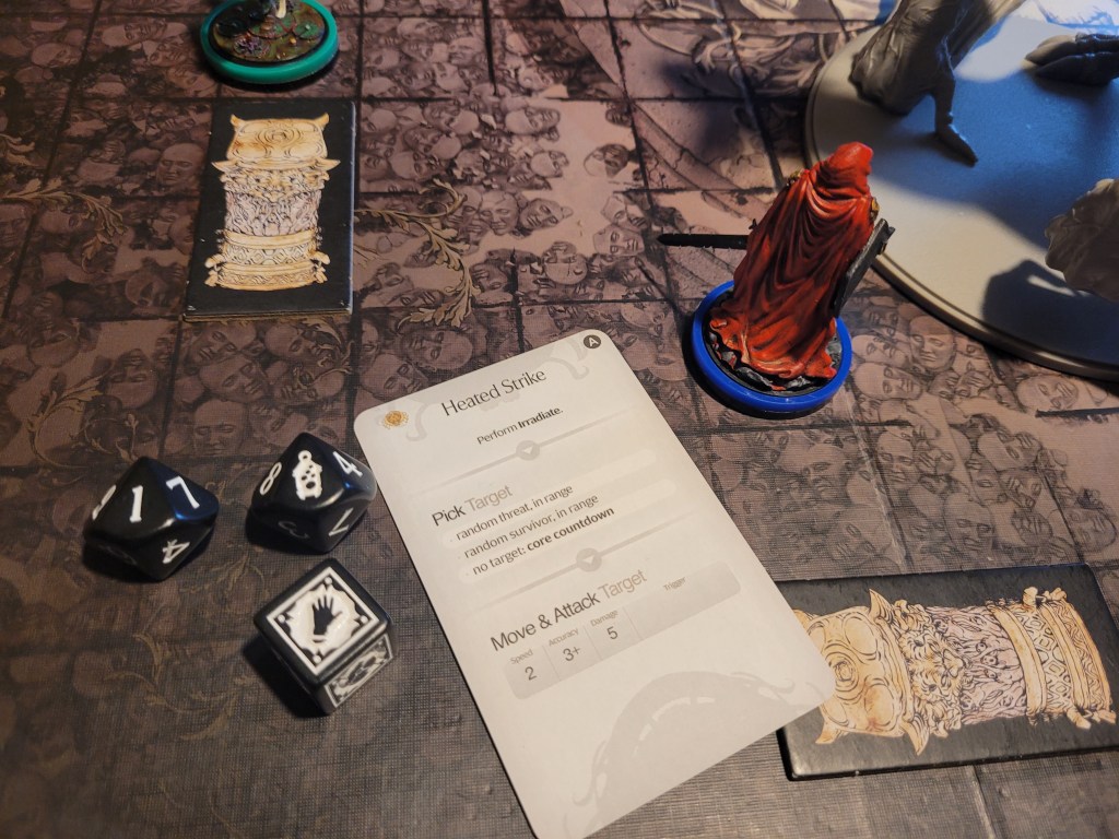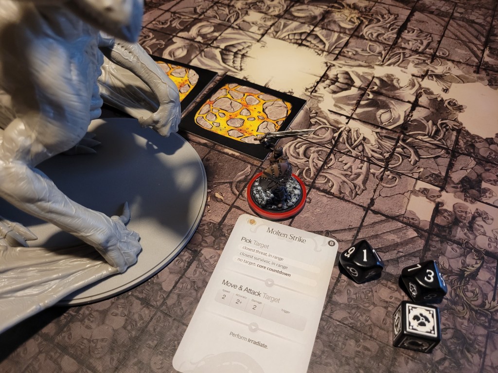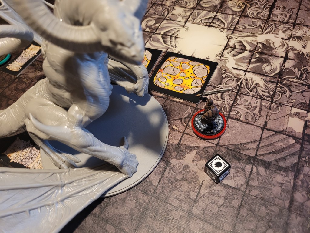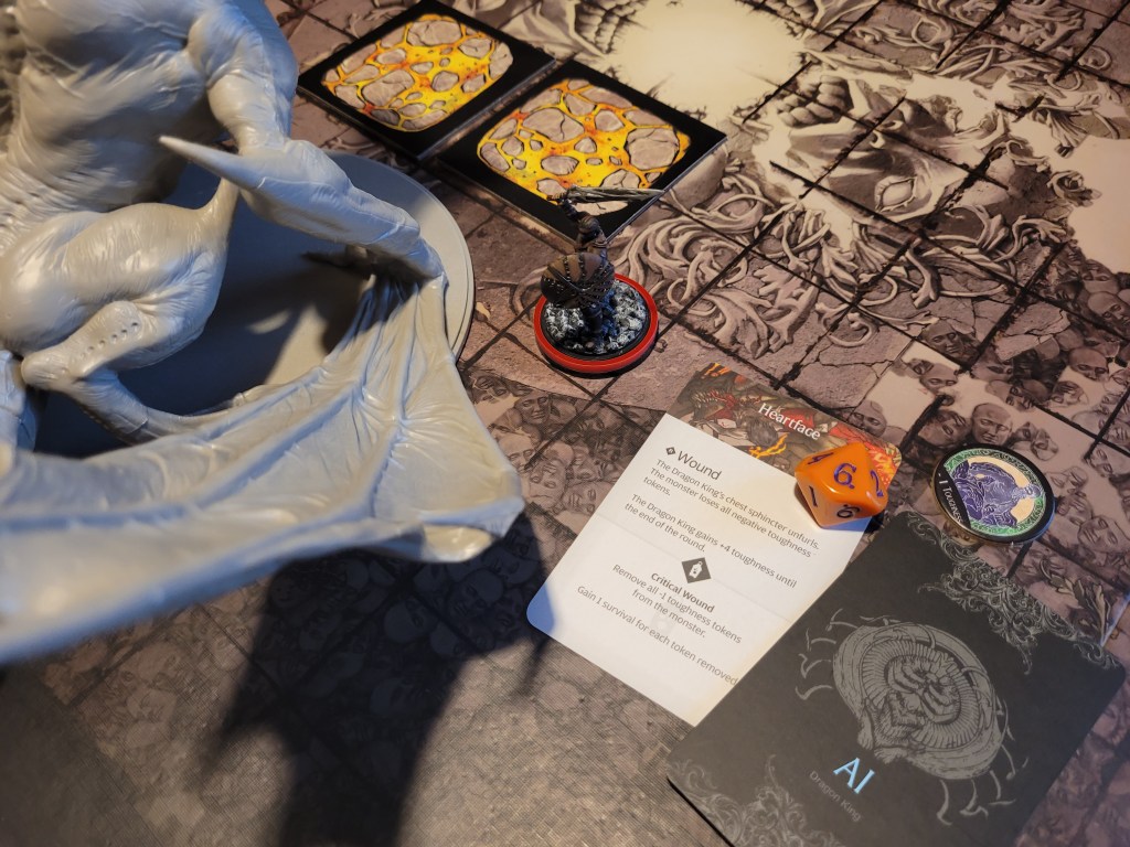 With Lava Pools splashing onto the ground (Evil) Stalker also got his chance to attack, landing another blow against the Heartface, securing 1 final wound for the round and removing the -1TGH-token(s) from the monster.