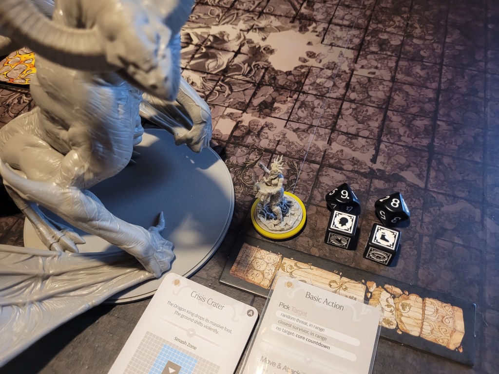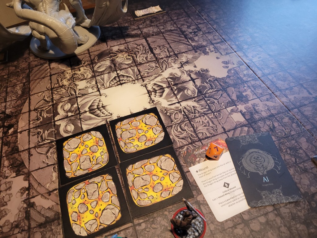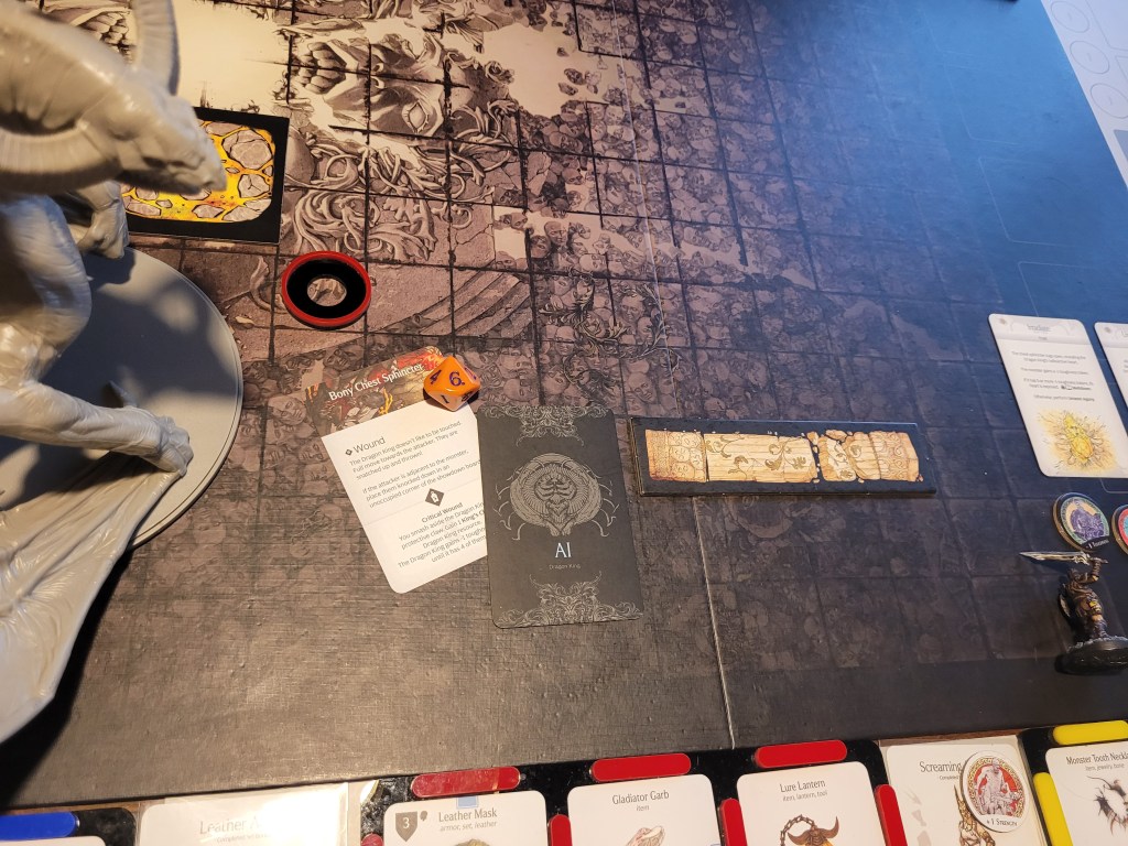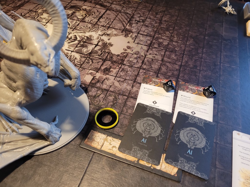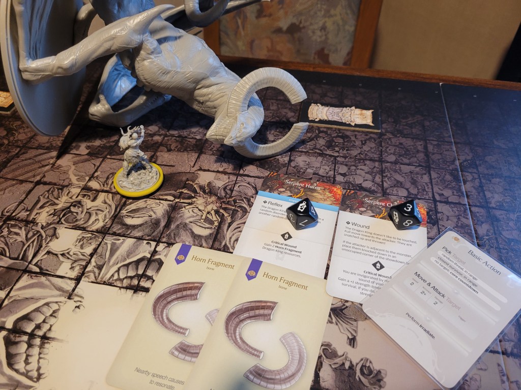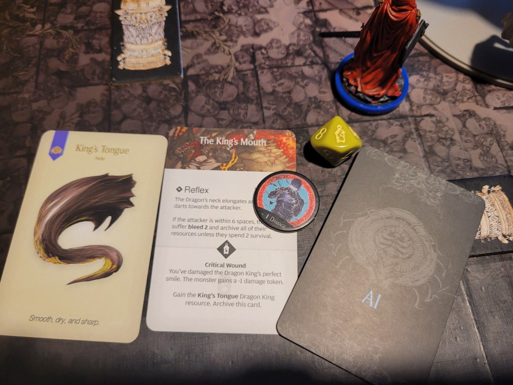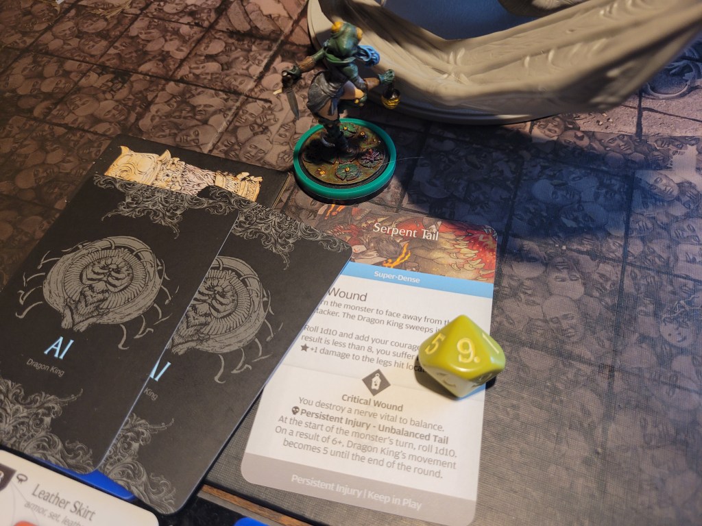 Frogdos was ready and waiting to lead the attack, bandaging first to get rid of 2 of his bleed tokens, he surged (regaining the survival via the tactics card) and he hit the Dragon King square in the mouth! Even dealing a critical wound to it! What an important first attack! -1DMG on the monster and a resource!