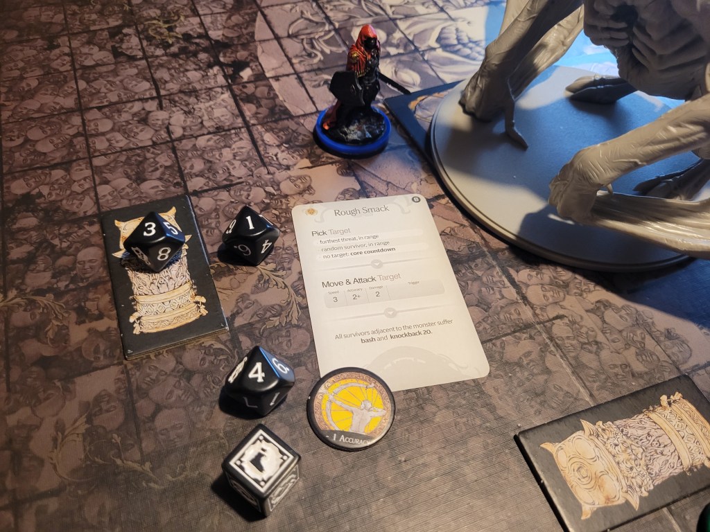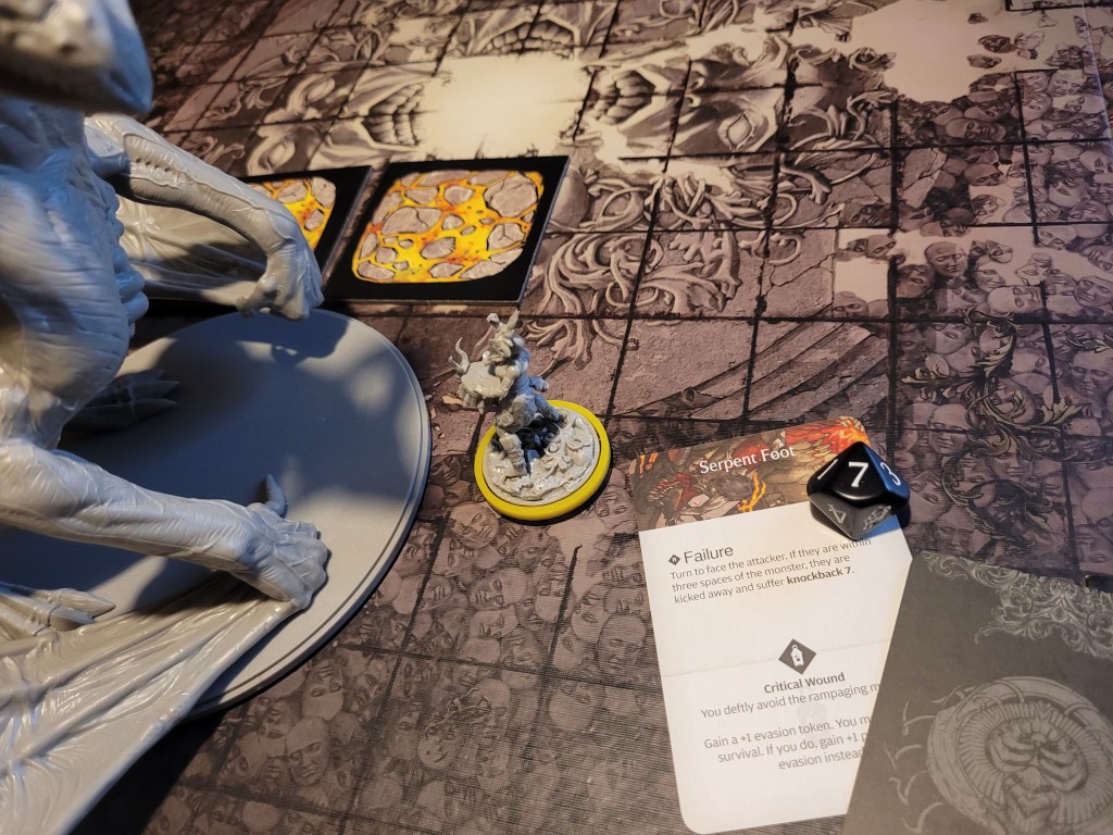 Whilst not confident in her abilities, I sent in Flare to try and attack the monster again, and despite me not believing in her, she managed to beat the odds and crit the Serpent Tail for 2 wounds thanks to savage! Great job!