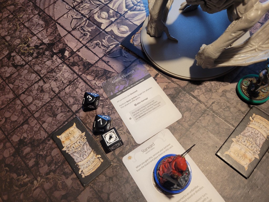 Frogdos then spent 1 survival to dash towards the monster (which he wouldn’t have needed to), and as he struck the Dragon King he found the monster’s trap before we ever triggered an Irradiate on a hit location. He was sent up into the heavens for the privilege.