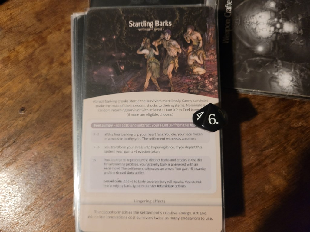 Startling Barks was drawn as our random event, Frogdos was randomly chosen and luckily he managed to roll a perfect Lantern 10 .. which then was turned into a 6 due to his 4 hunt xp. A +1EVA-token was nice, but more importantly he wasn’t dead.