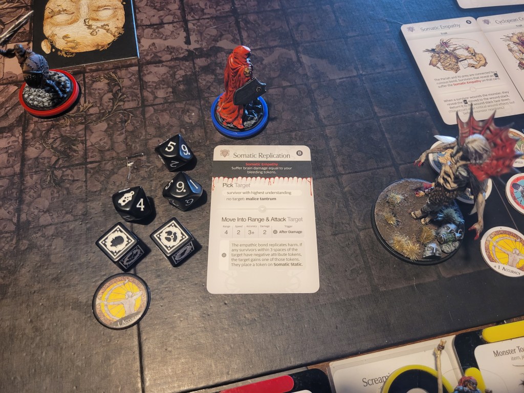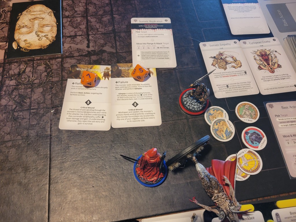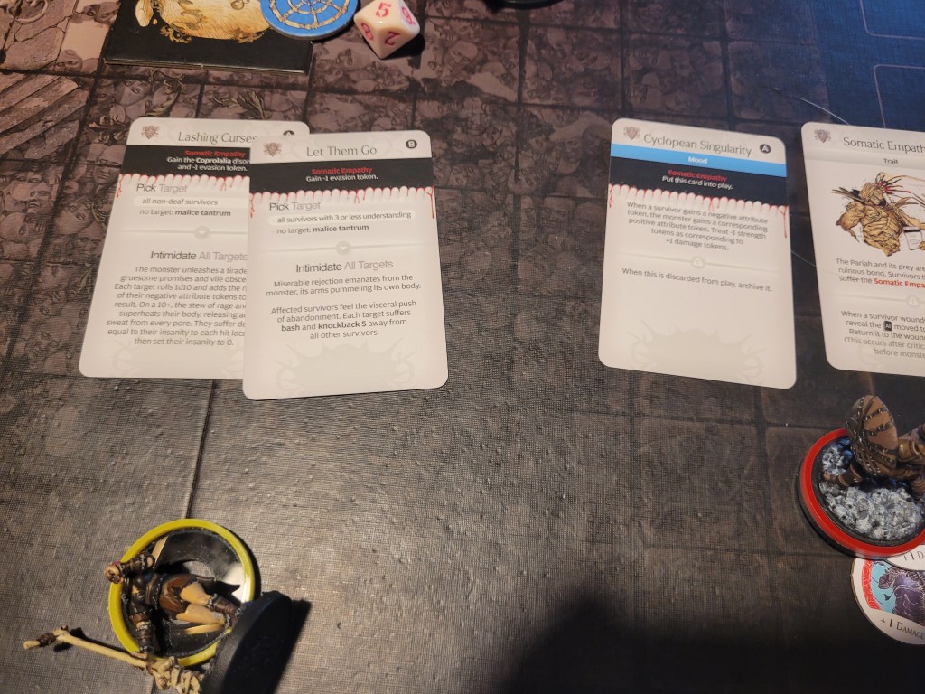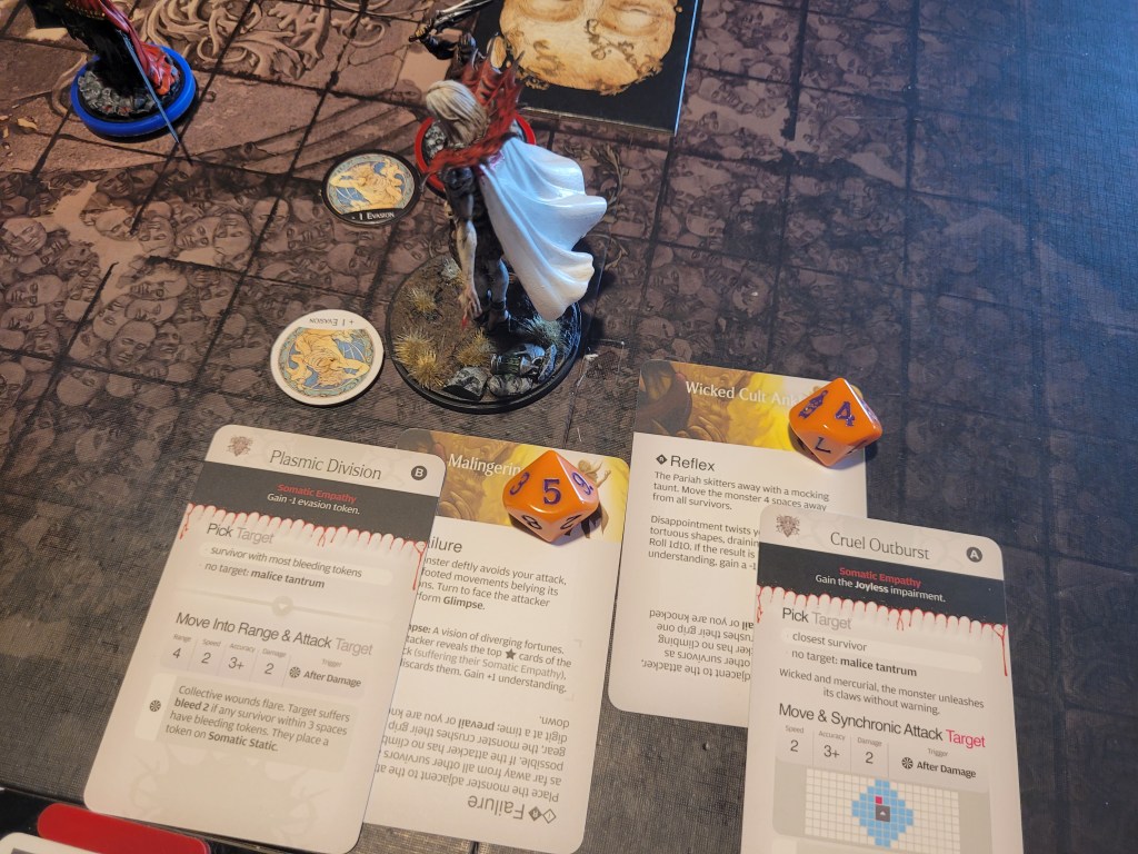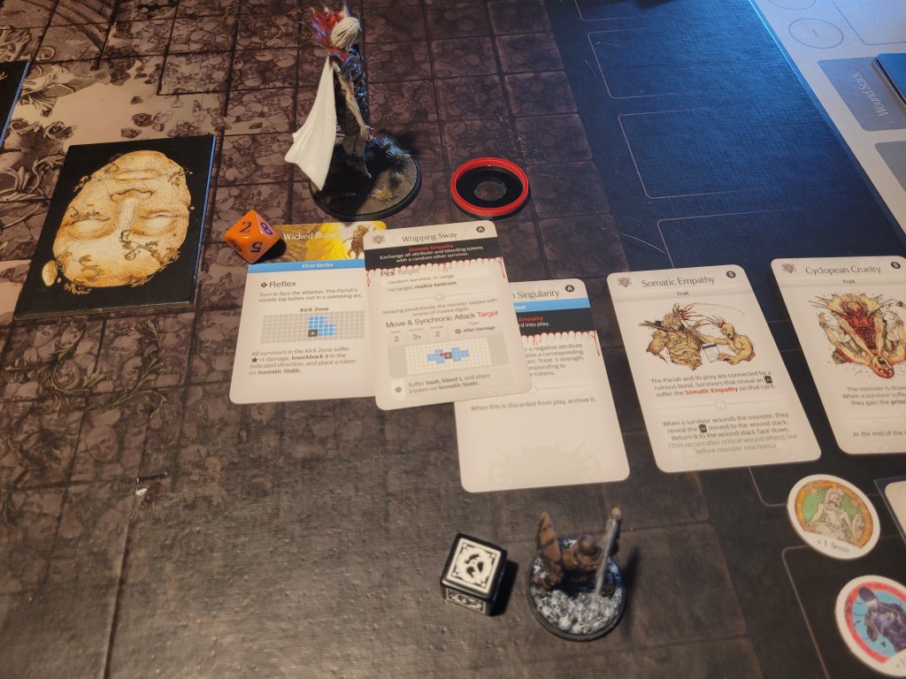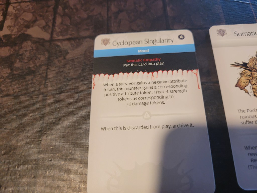 Besides Somatic Empathy and Somatic Static, the monster now also features the Cyclopean Cruelty trait. This means that any survivor who suffers a severe injury during the fight also gains the Priority Target token, furthermore this trait also allows the monster to draw a 2nd card per turn. This means it is going to pile on and double up time and time again!