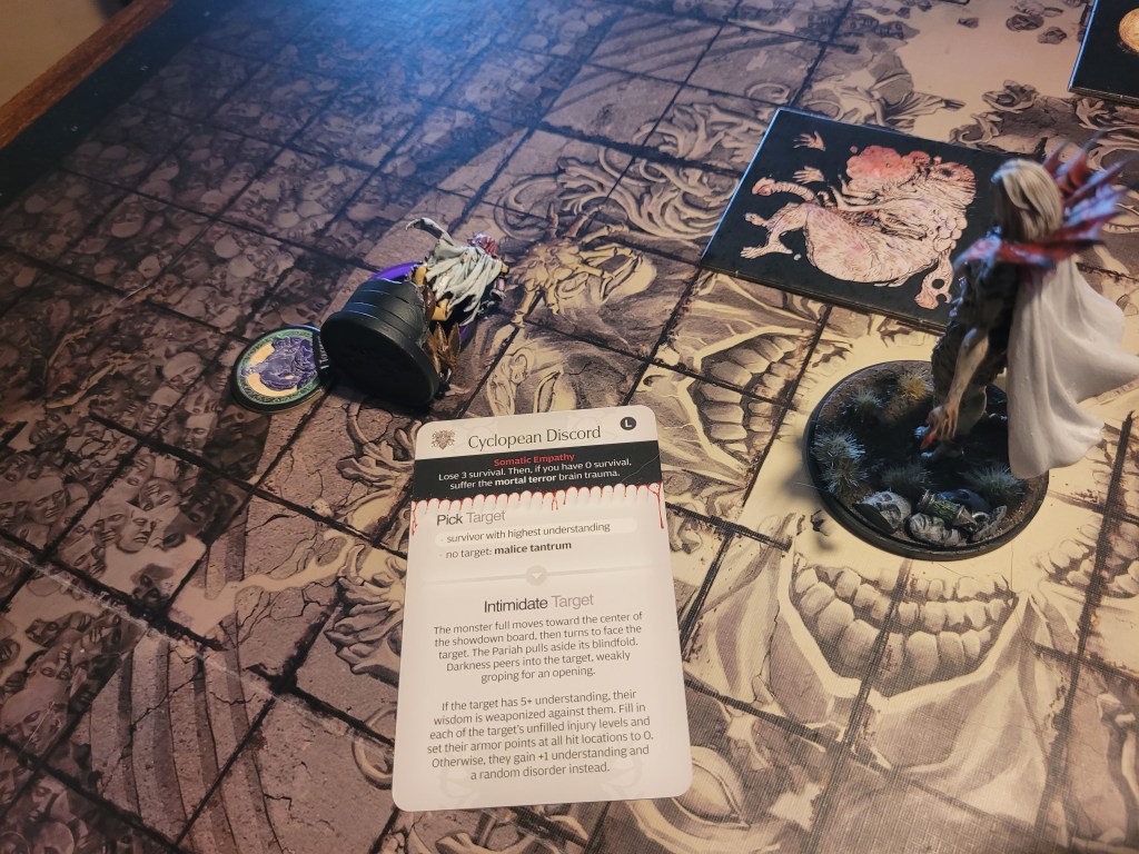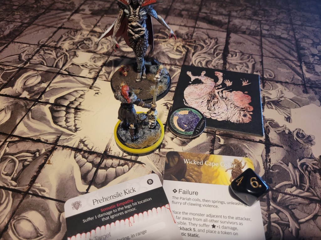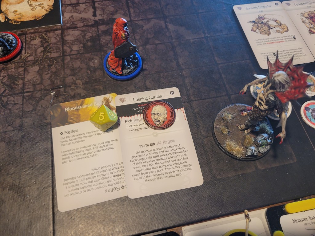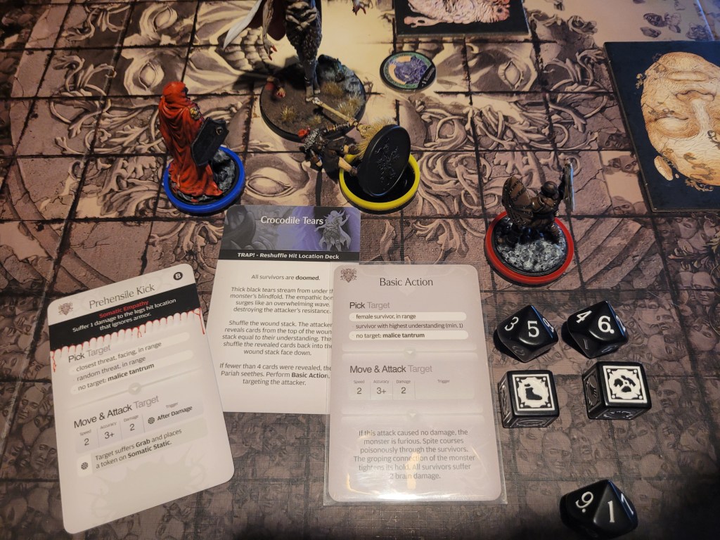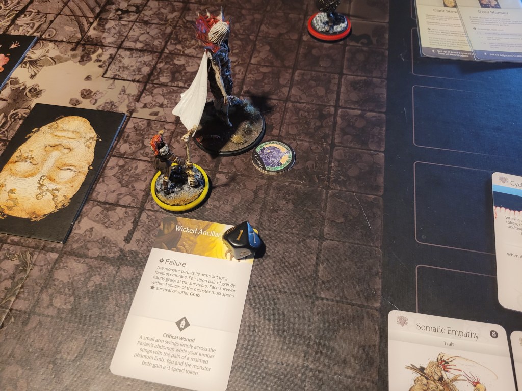 Besides Somatic Empathy and Somatic Static, the monster now also features the Cyclopean Cruelty trait. This means that any survivor who suffers a severe injury during the fight also gains the Priority Target token, furthermore this trait also allows the monster to draw a 2nd card per turn. This means it is going to pile on and double up time and time again!