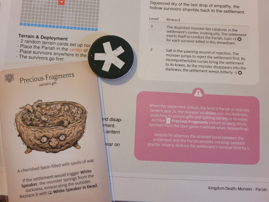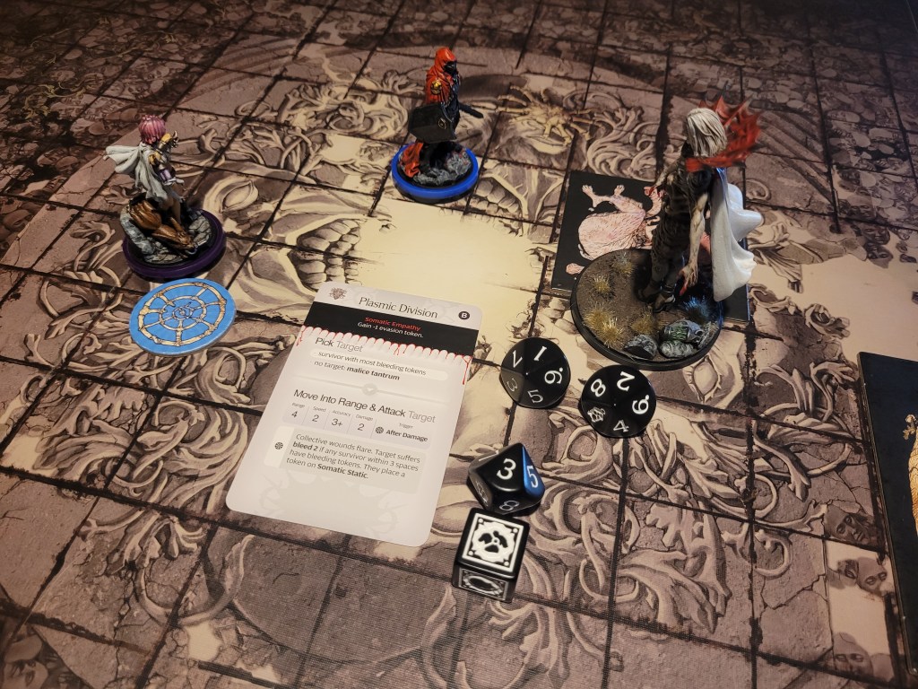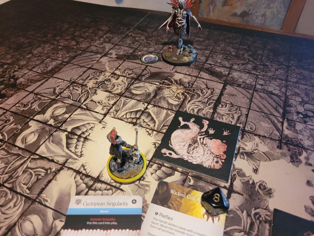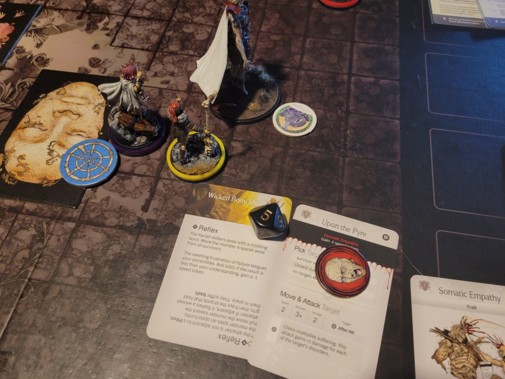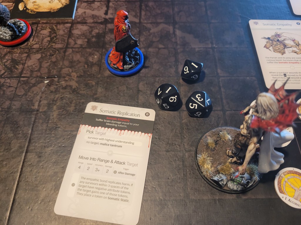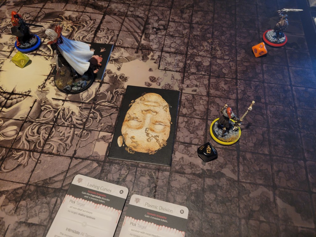 Besides Somatic Empathy and Somatic Static, the monster now also features the Cyclopean Cruelty trait. This means that any survivor who suffers a severe injury during the fight also gains the Priority Target token, furthermore this trait also allows the monster to draw a 2nd card per turn. This means it is going to pile on and double up time and time again!