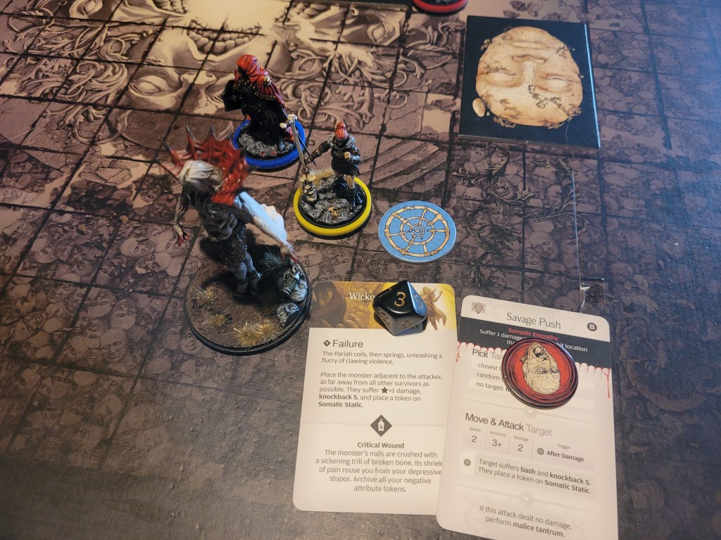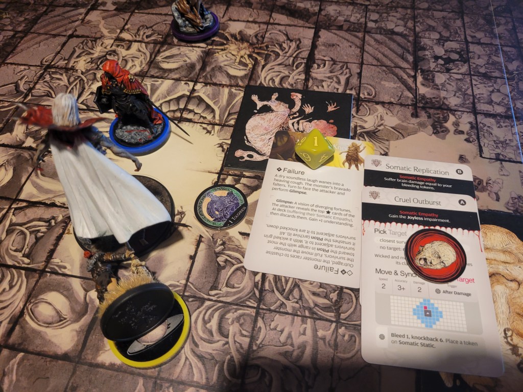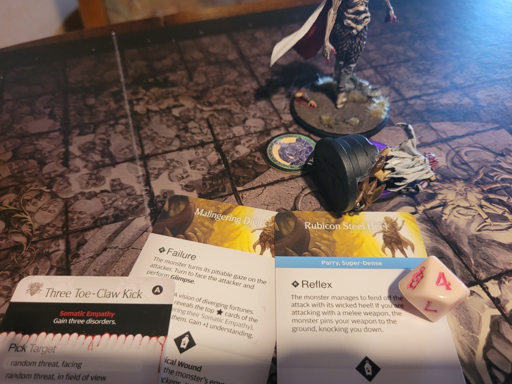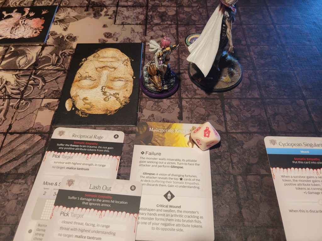 Frogdos took the chance to circle around the monster and attack into a fresh deck. The first wound failed on 2+ and he suffered a glimpse that would give him joyless. Luckily he had the Somatic Static token to discard and retain his ability to surge! His sword’s effect also triggered on the failure and he was presented with a 2nd chance to wound. This time he succeeded but gained Anhedonia (D) from it. This made him permanently sane and turned off all his abilities so he got flung away by the capricious monster!