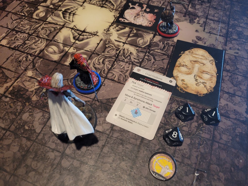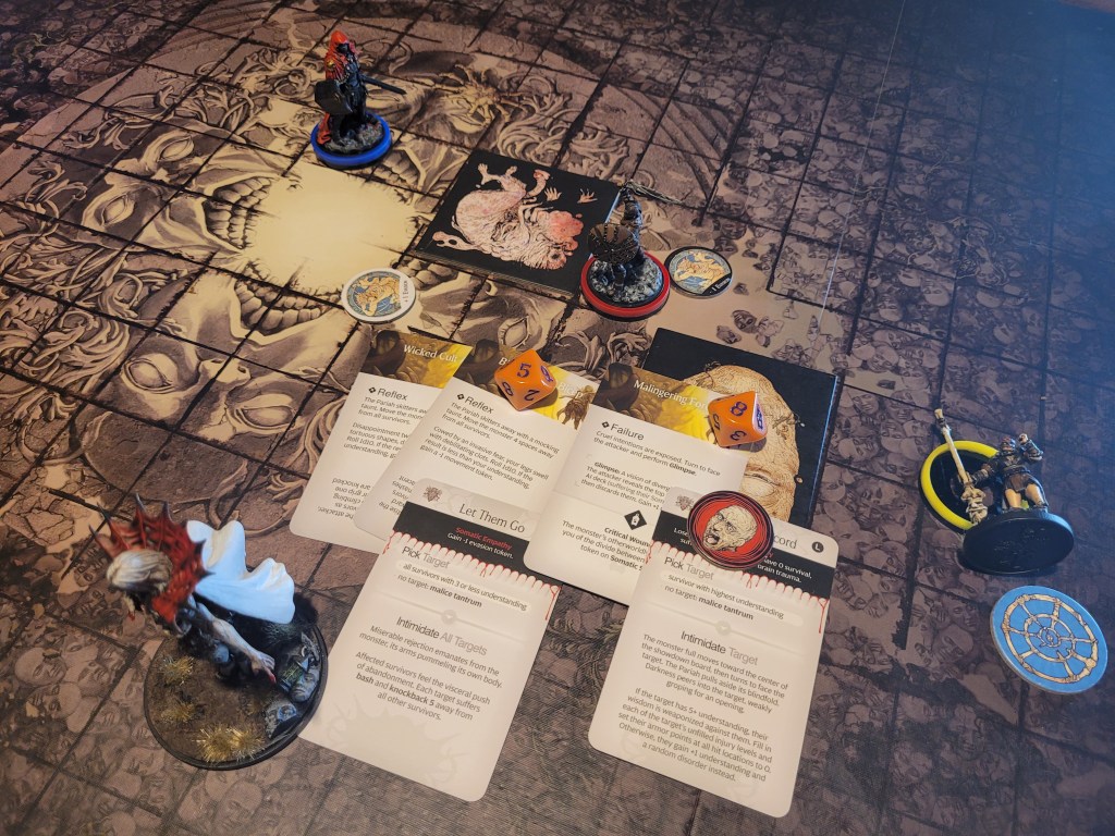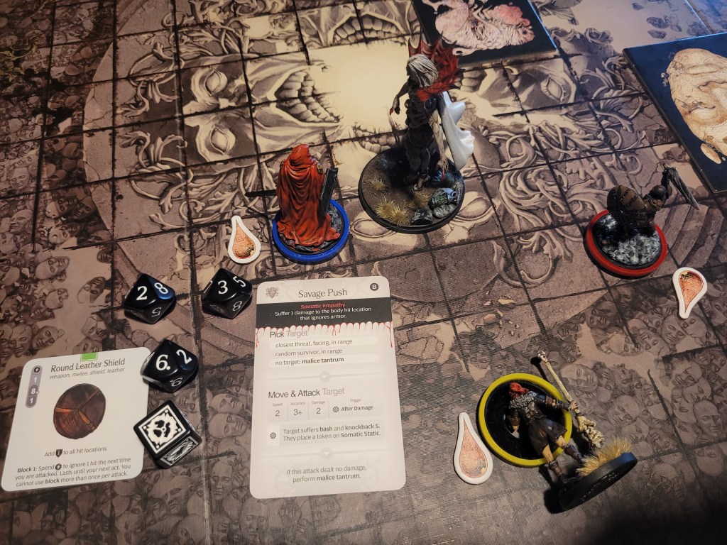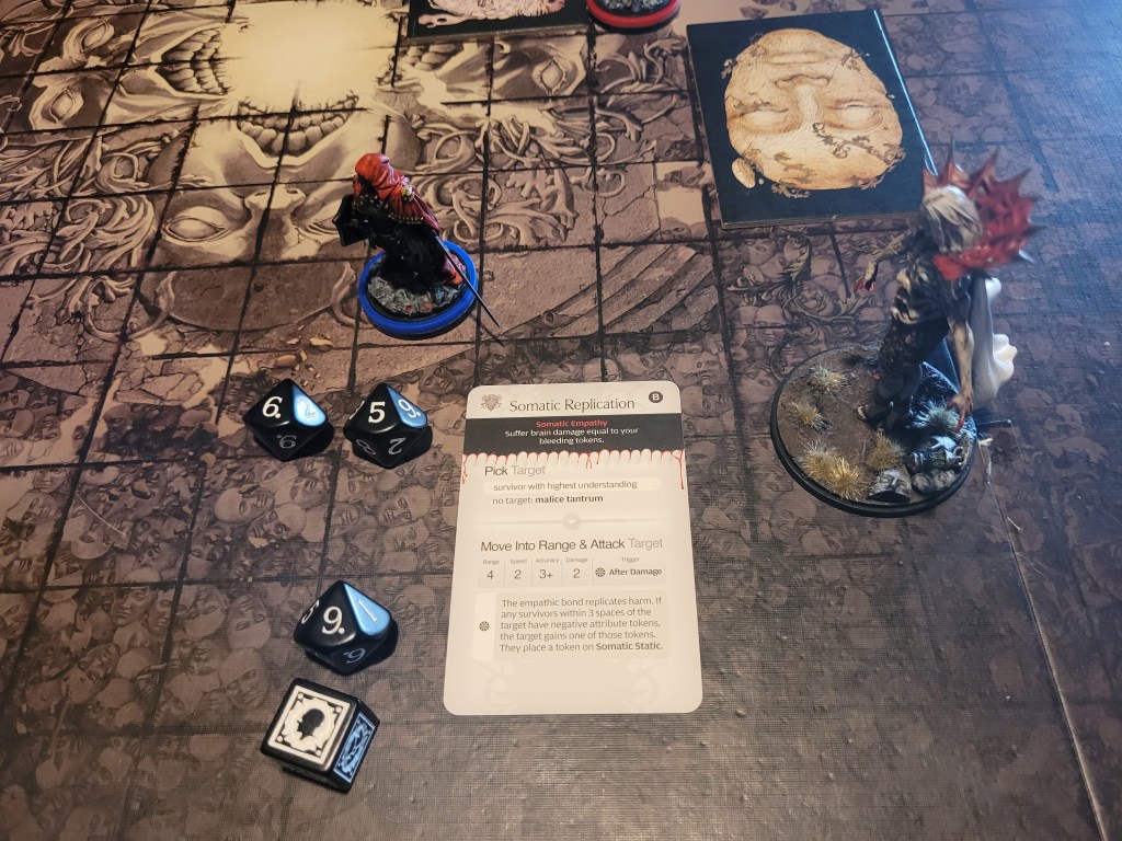 Frogdos took the chance to circle around the monster and attack into a fresh deck. The first wound failed on 2+ and he suffered a glimpse that would give him joyless. Luckily he had the Somatic Static token to discard and retain his ability to surge! His sword’s effect also triggered on the failure and he was presented with a 2nd chance to wound. This time he succeeded but gained Anhedonia (D) from it. This made him permanently sane and turned off all his abilities so he got flung away by the capricious monster!