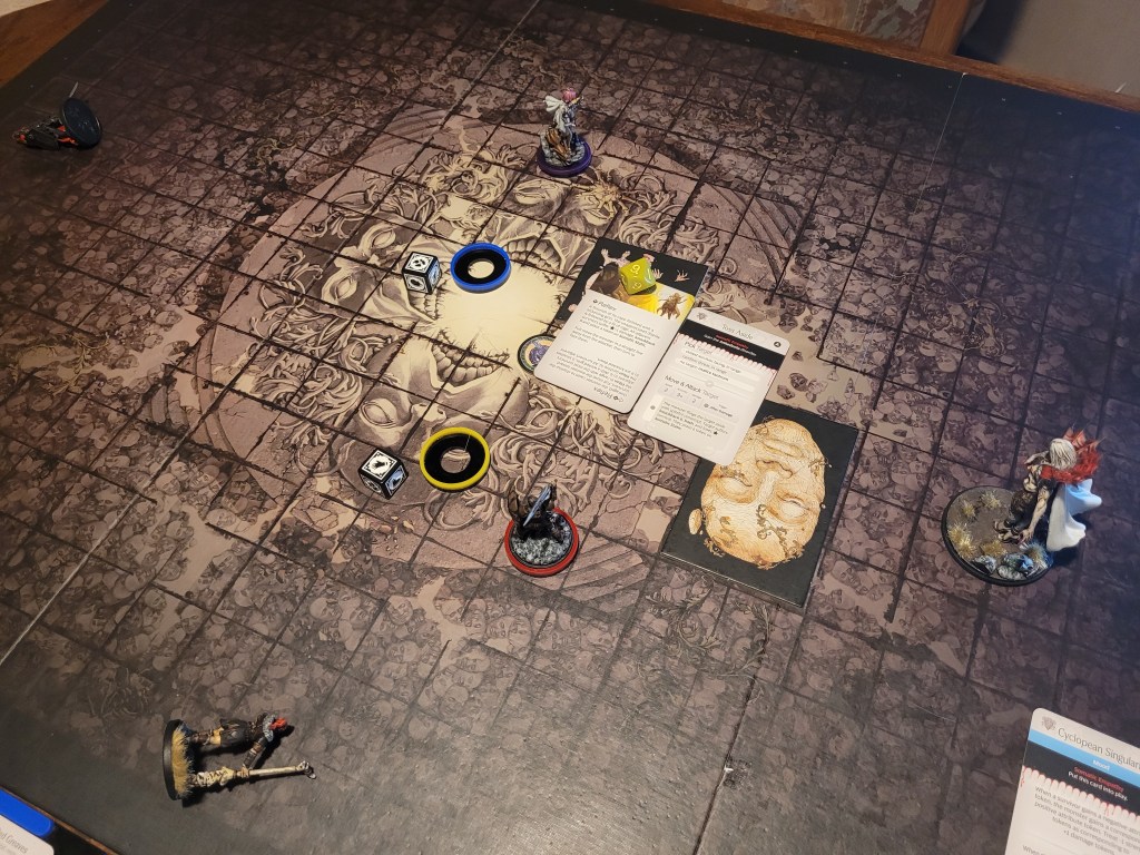 Bastet was the one to start us off with a dash and a Slam into the monster. She used the Maul Scab for its additional STR, and she wounded once, taking 1DMG to her legs from Somatic Empathy. Blow for blow, we had achieved first blood. She did decide to go ahead and surge as well, dealing one of the worst possible wounds to get early: putting Cyckopean Singularity into play via the Somatic Empathy effect.