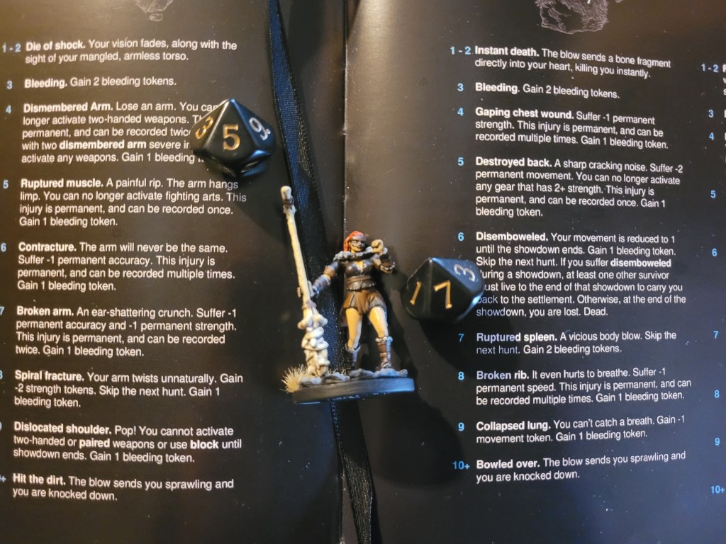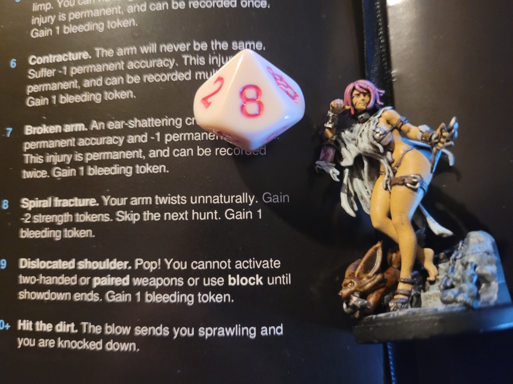 Finally Candy dashed towards the monster ready to Leap into the small gap between the Pariah and the terrain piece. 1 single perfect hit was landed, which turned out to be a crit. The crit itself did nothing for her, besides dealing 2 wounds, before Candy was first frenzied and then forced to suffer a severe arm injury – Spiral Fracture?! That’s terrible! That’s +2DMG for the Pariah! And priority target on Candy as well!