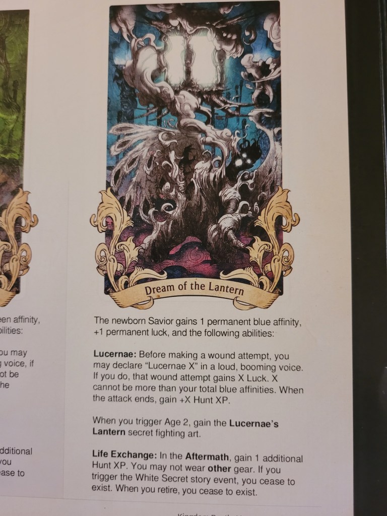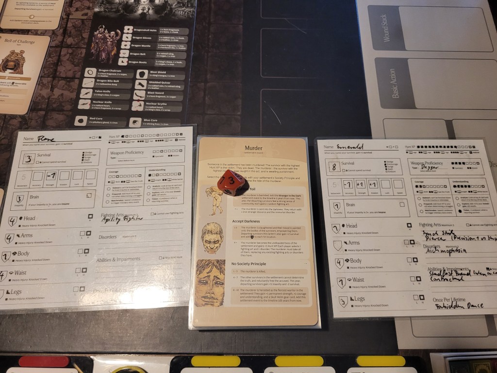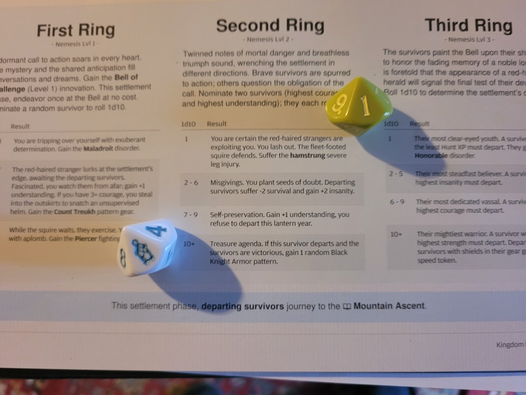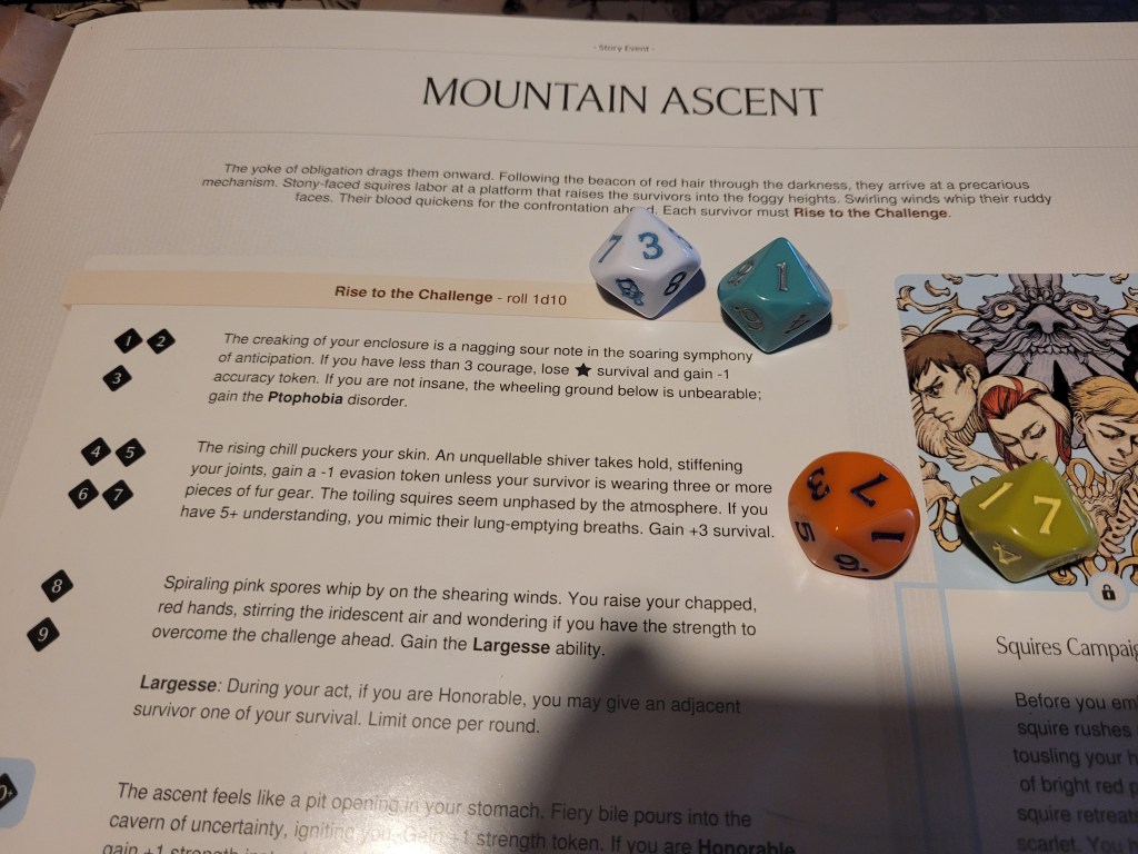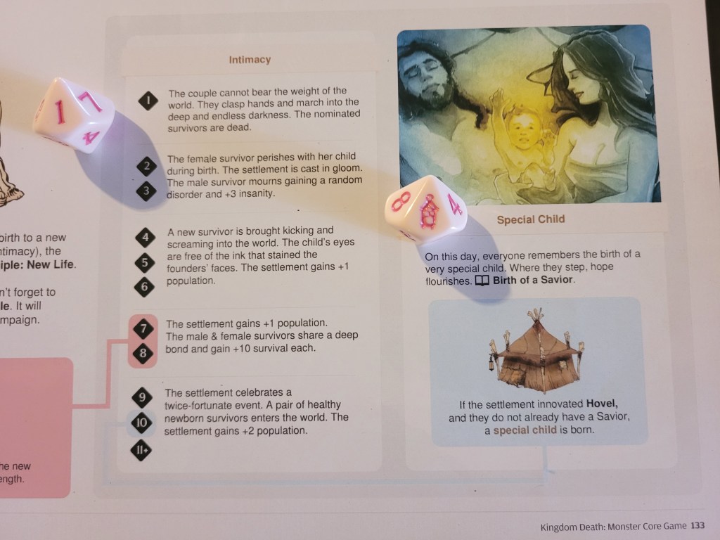We needed to counteract our settlement slowly dying out, so we desperately needed some more babies. Needless to say, I spent both endeavors we had on augury with Lucky. He gained 1 survival before he did manage to trigger intimacy after all. And he rolled a 1 and a 10.