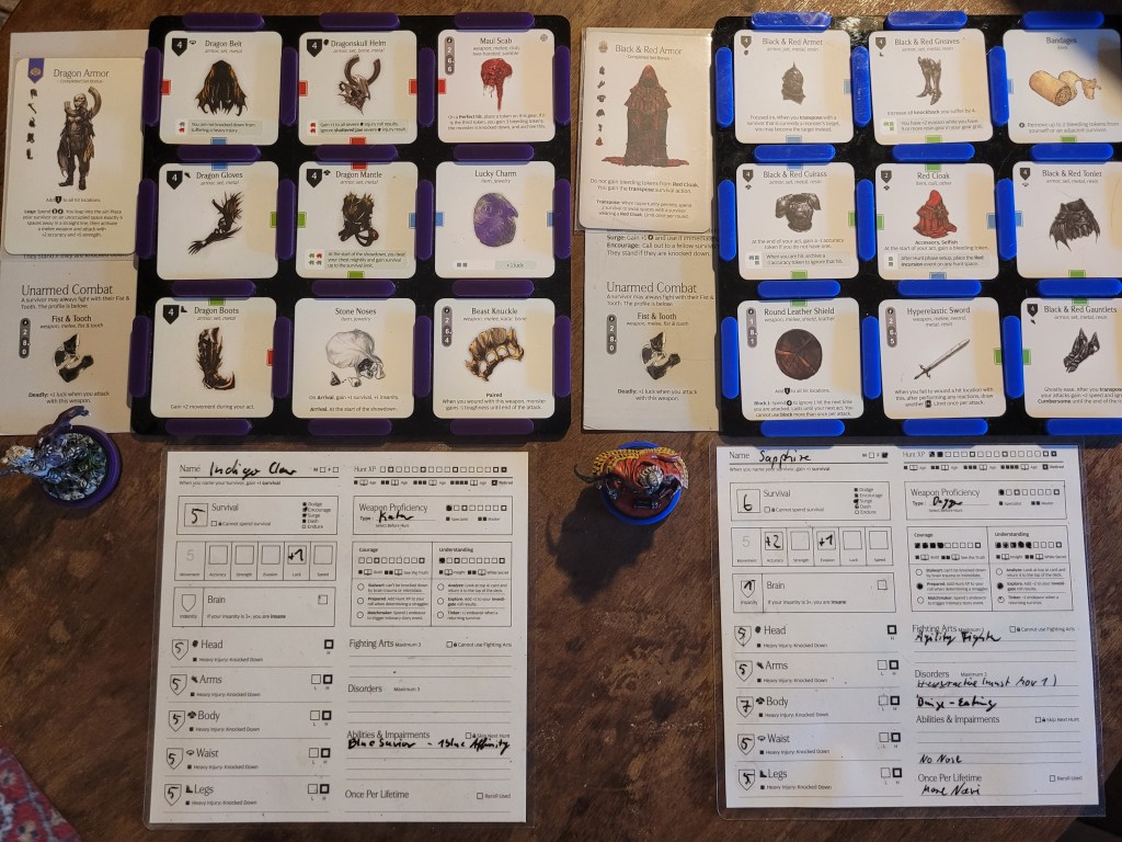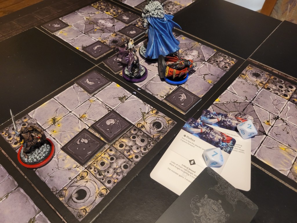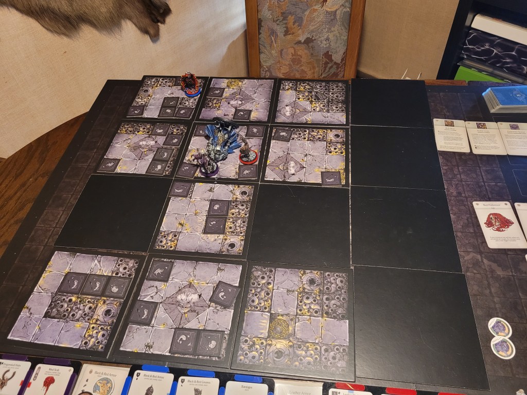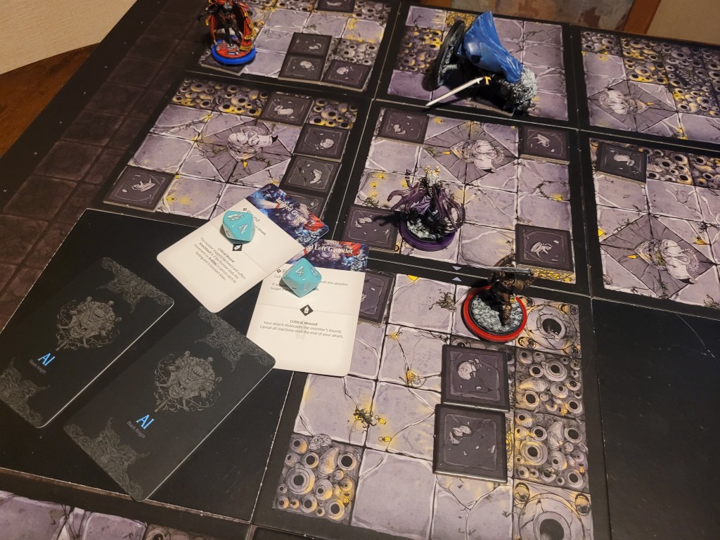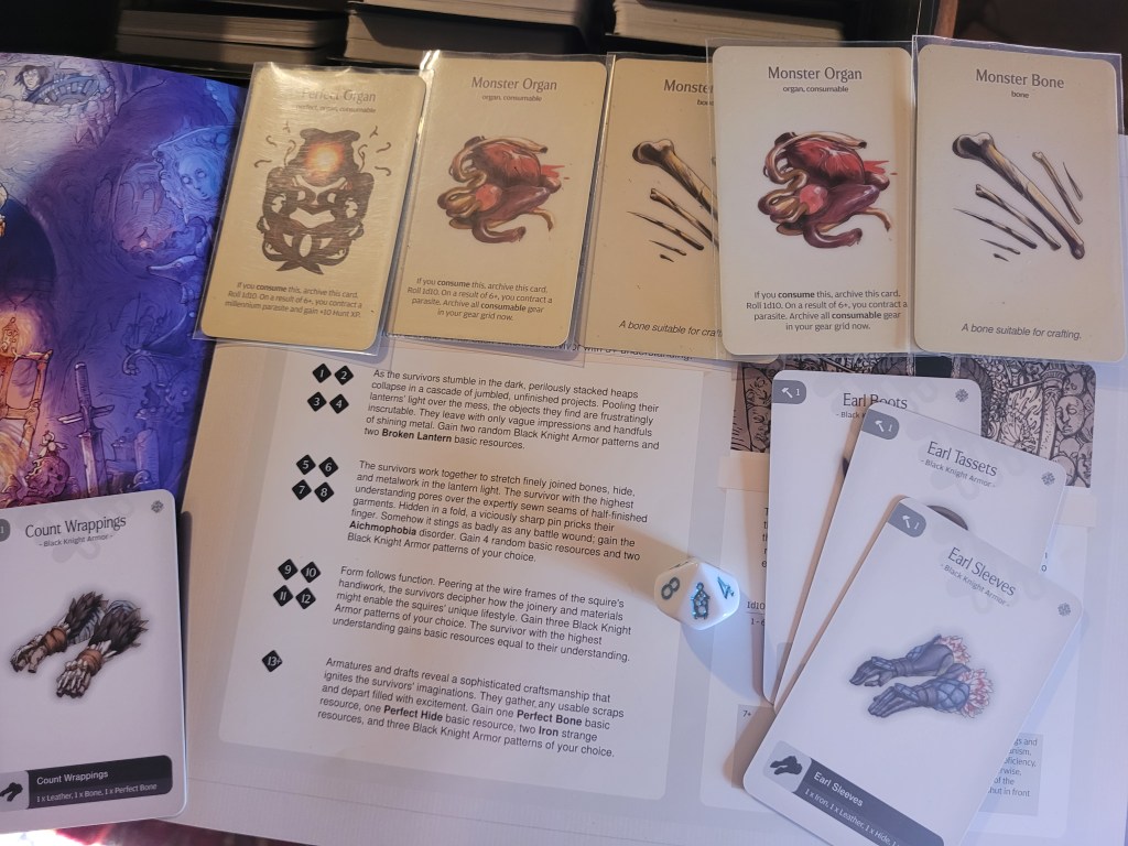 As we then moved into the Darkened Workshop we did high-roll our rewards as well! 10+2 did allow us to take not only the remaining Earl set patterns and 5 basic resources (Sapphire had 5 understanding) but thanks to the Bell Tolls event, Sapphire also got to take the Count Wrappings pattern (randomly drawn) back home for surviving the encounter!