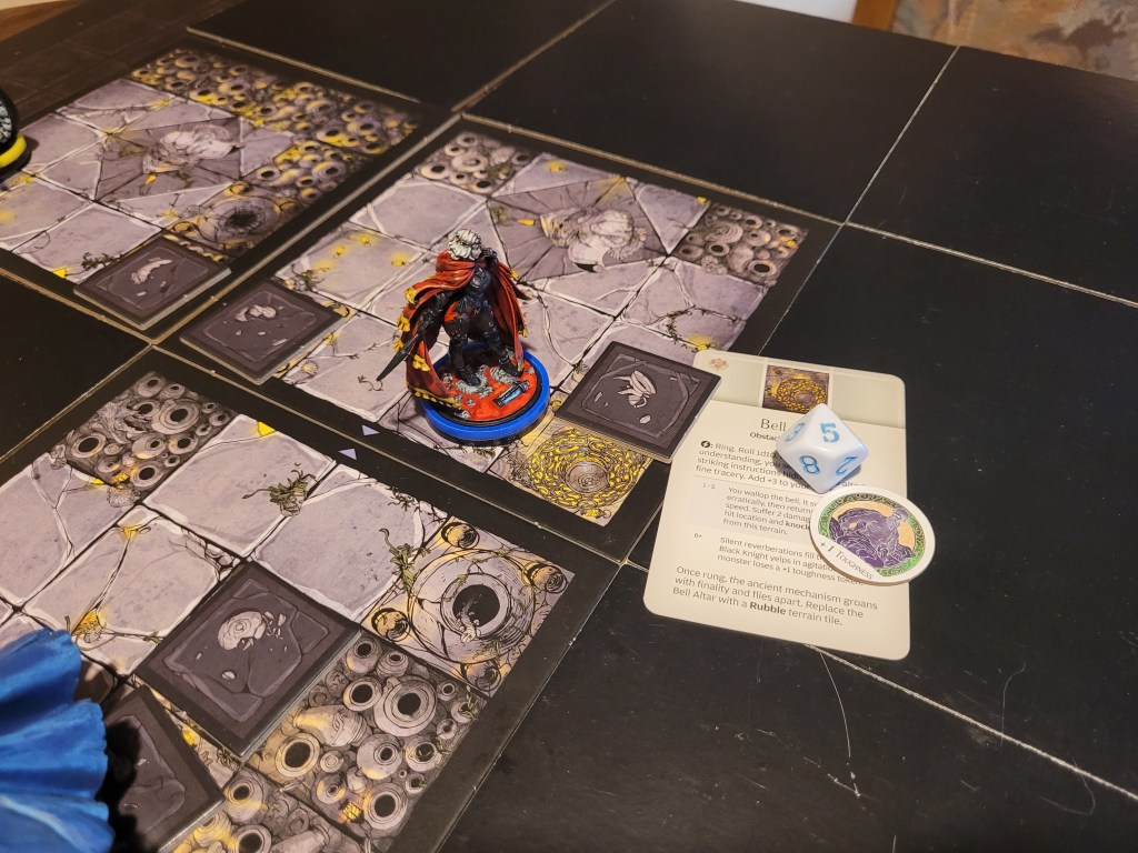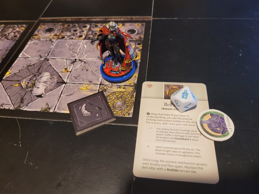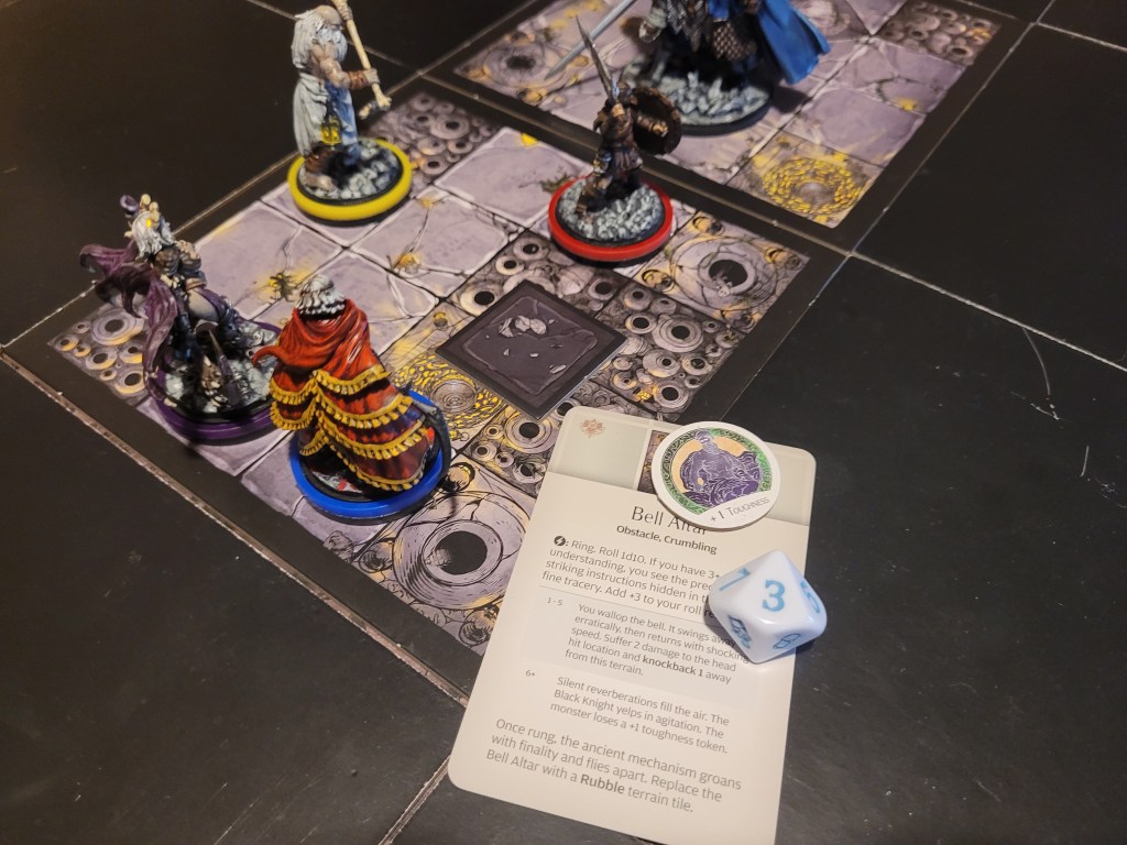 For our first activation, Sapphire quickly removed a +1TGH-token by activating the Bell Altar and moved over the resulting Rubble and out of the potential knockback zone.