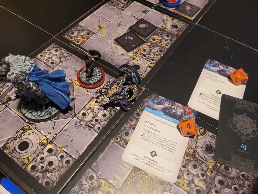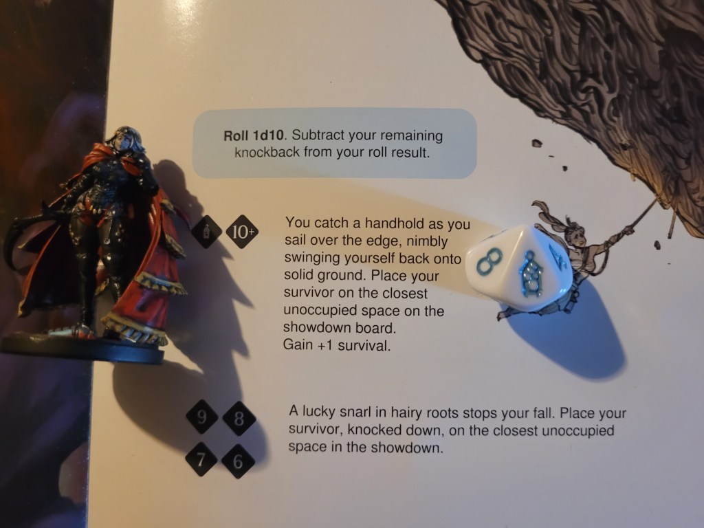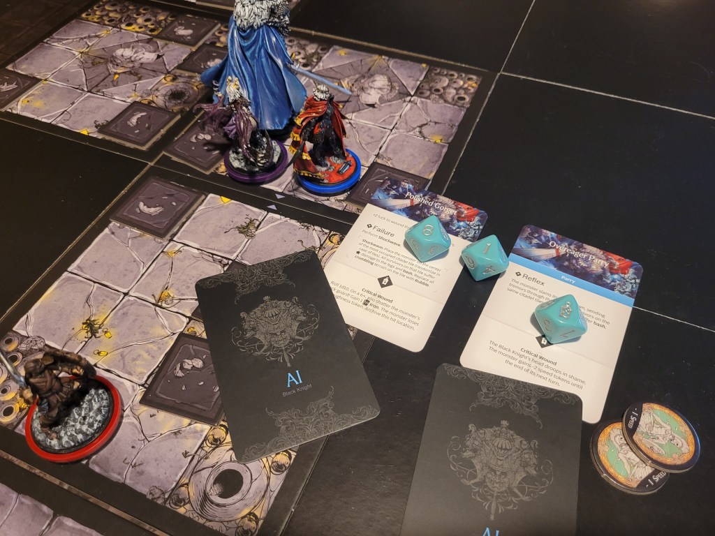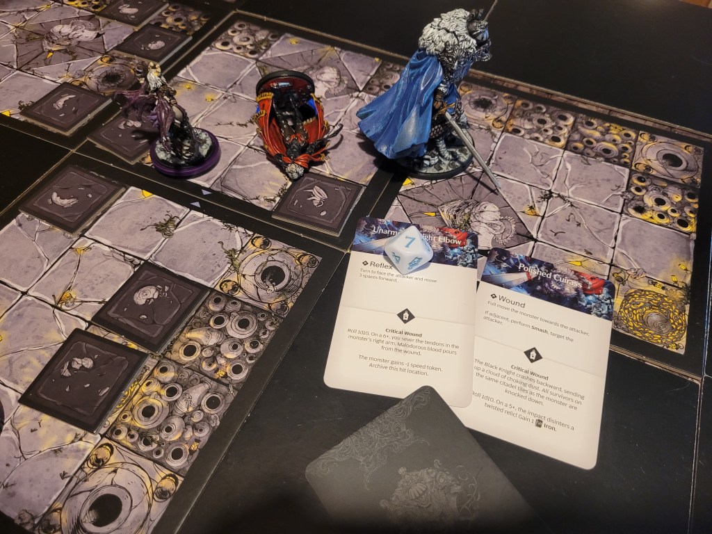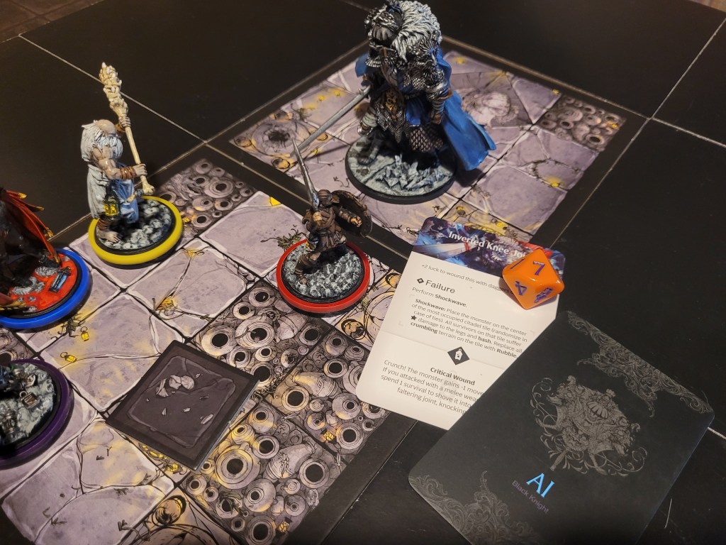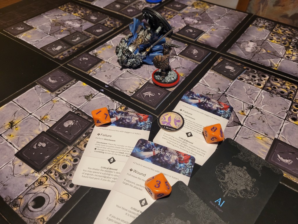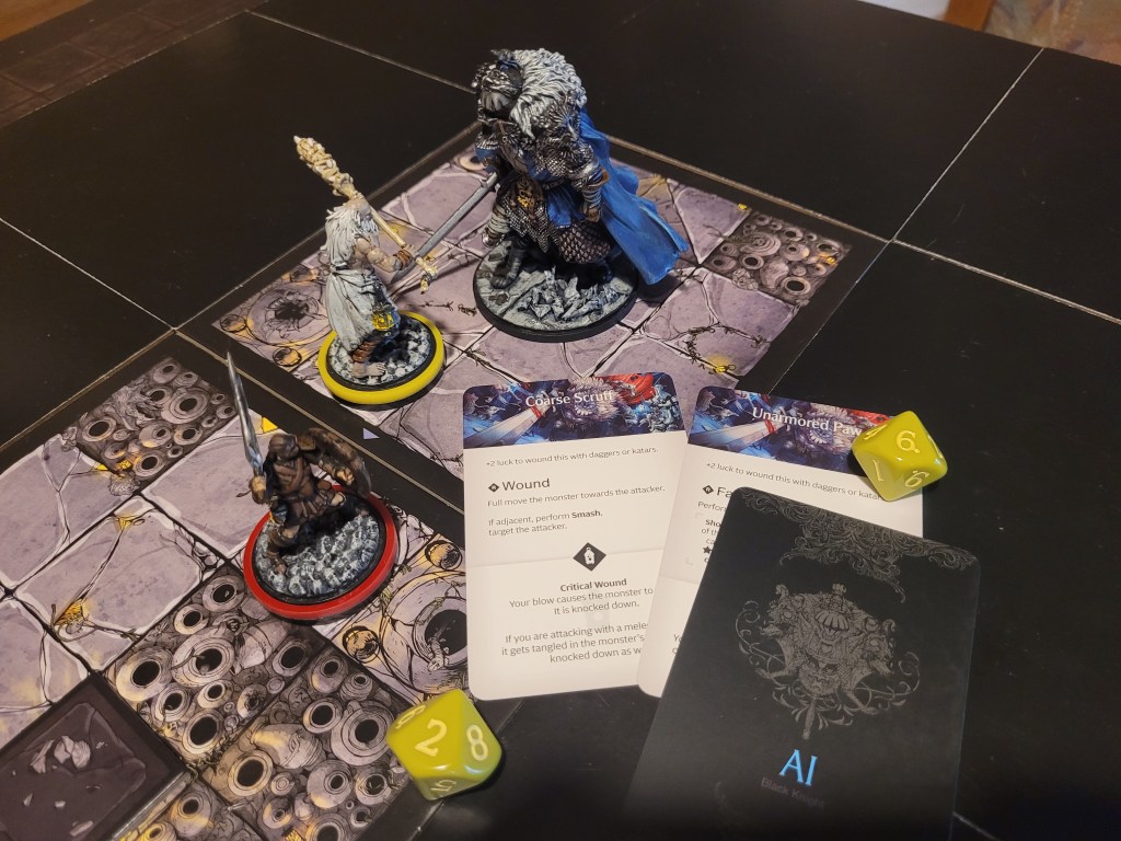 Lucky spent the survival to encourage Indigo before he went in to attack: 3 hits were enough to remove 1 additional +1TGH-token for a change! He did not draw the trap, so that was a good start for the team! And the first wound turned out to be a crit as well – giving him the opportunity to spend 1 survival to knock the Black Knight down, which he did without a second thought. The next wound failed, but without reactions it mattered little, before he got the third one in, paving the way for his daughter.