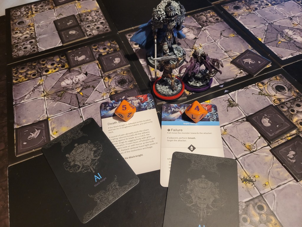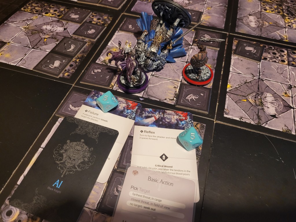 After having just lost a compatriot, Lucky was presented with the Black Knight’s blindspot and whilst the fury he felt managed to finally remove the ACC-token on the attack, he got a glimpse into the monster’s helmet and couldn’t help but run away! He wasn’t brave enough to face the truth of our foe!