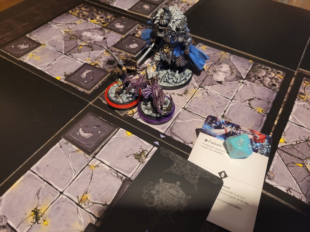 Indigo spent her turn revealing the 2 tiles behind us before Flatfish dashed into range to Slam into the monster, dealing 1 more wound against its Unarmored Paw.