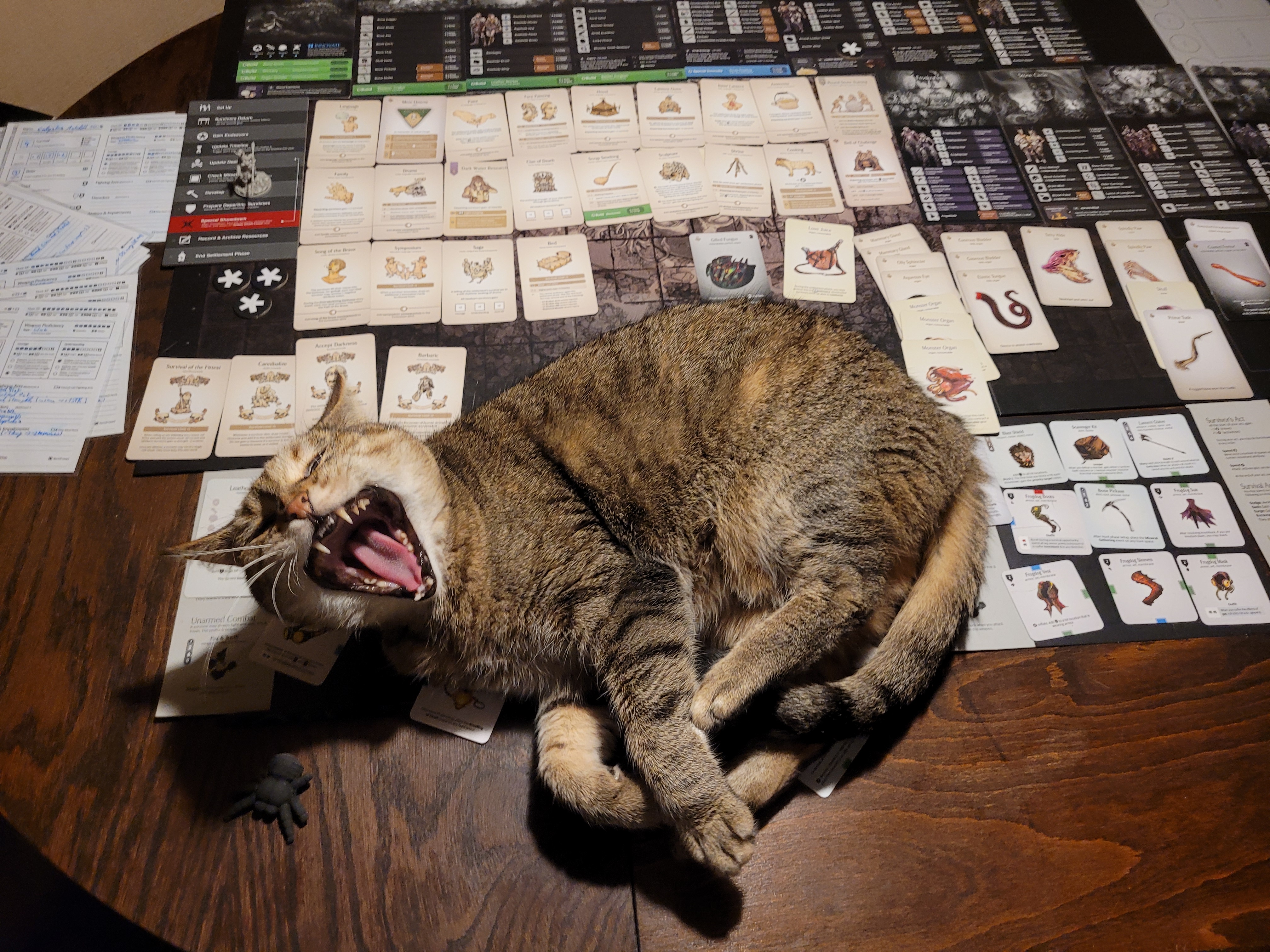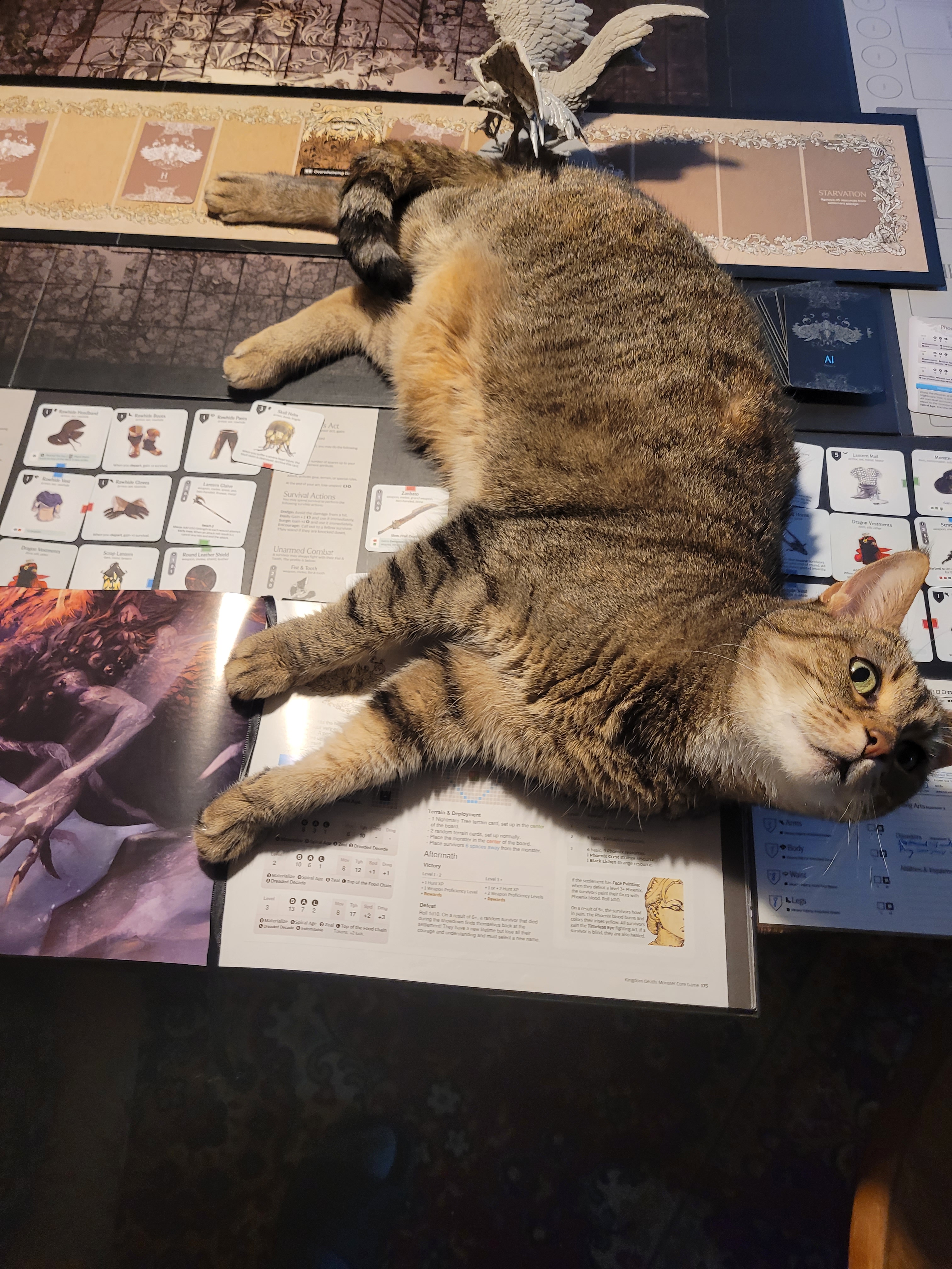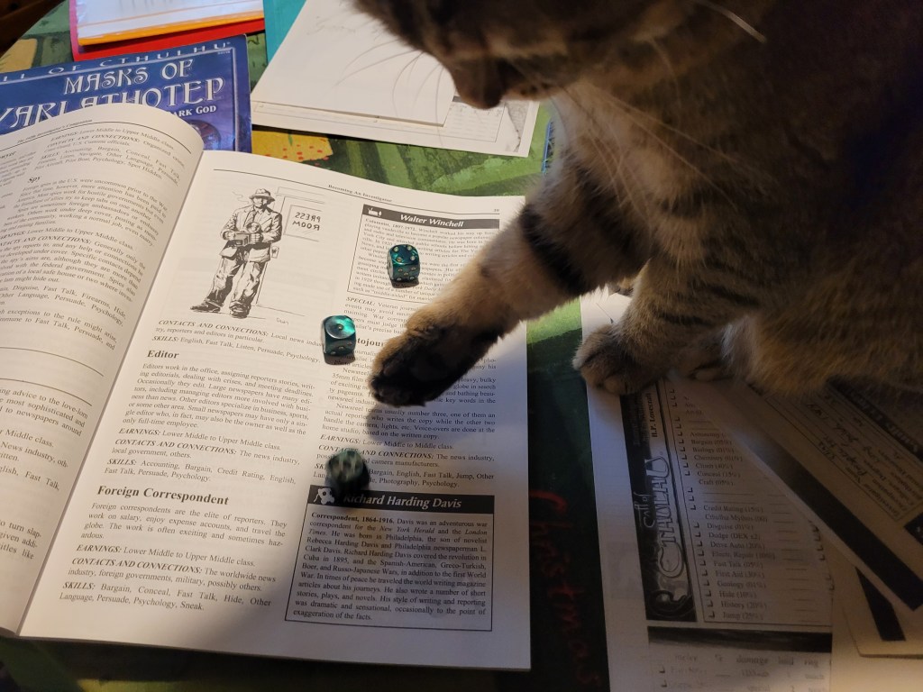 It’s not all KD:M for her though, she also likes messing with my Call of Cthulhu preparations, long naps and snacking on treats.