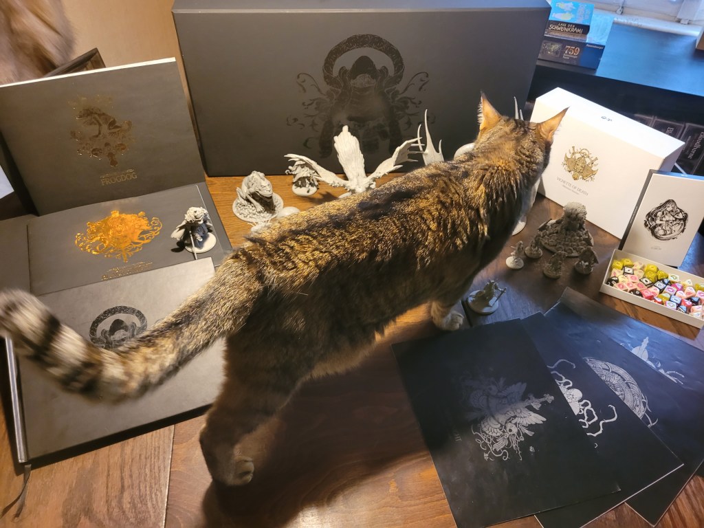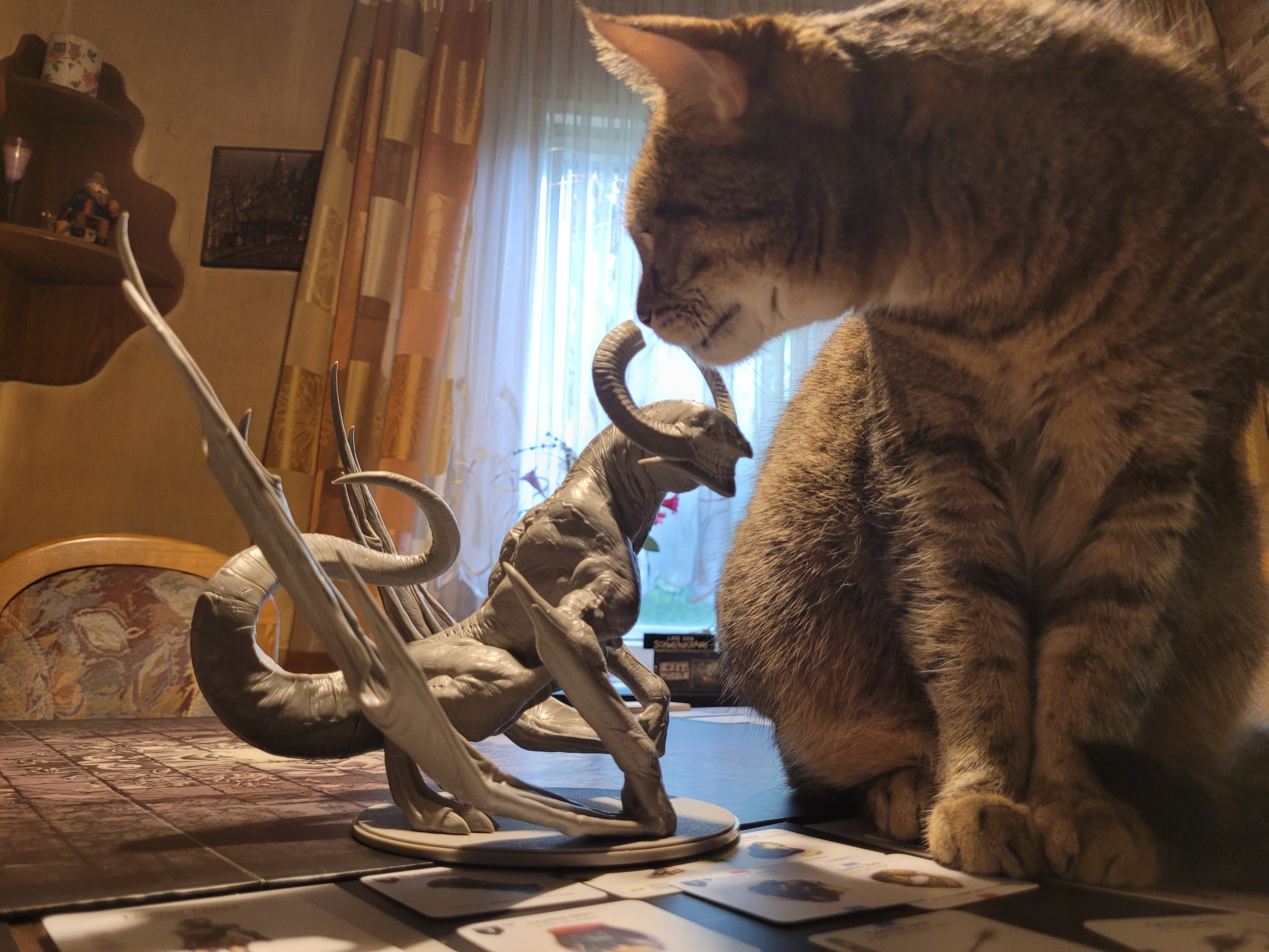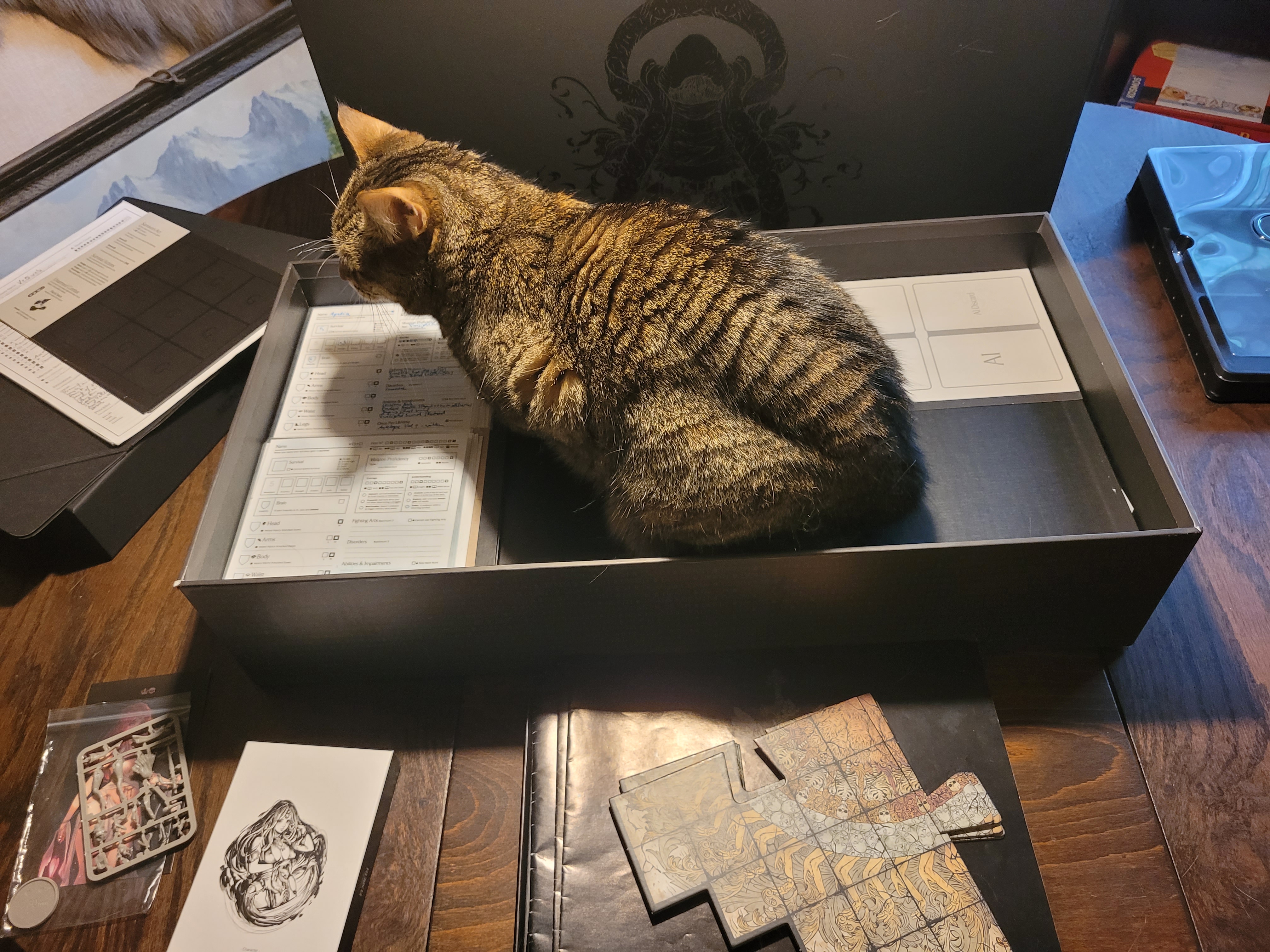 It’s not all KD:M for her though, she also likes messing with my Call of Cthulhu preparations, long naps and snacking on treats.